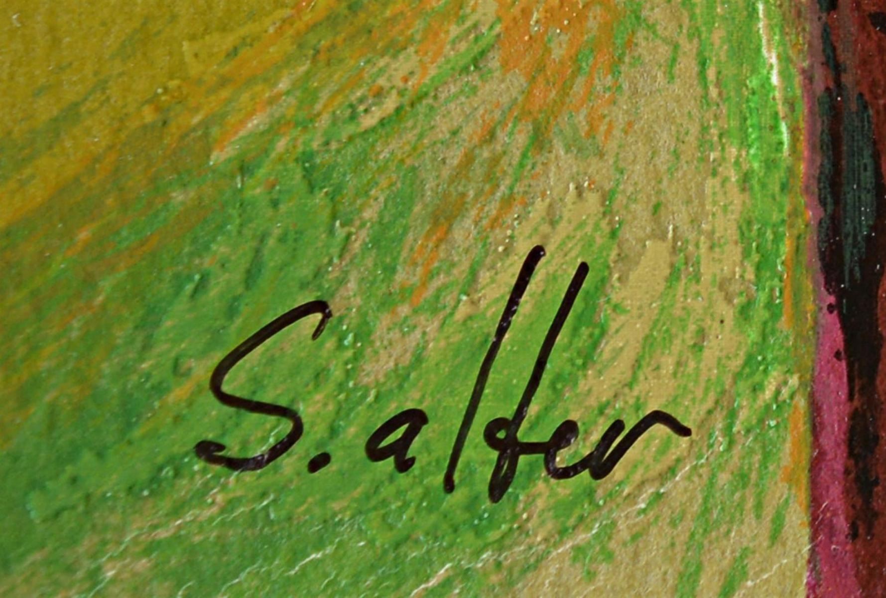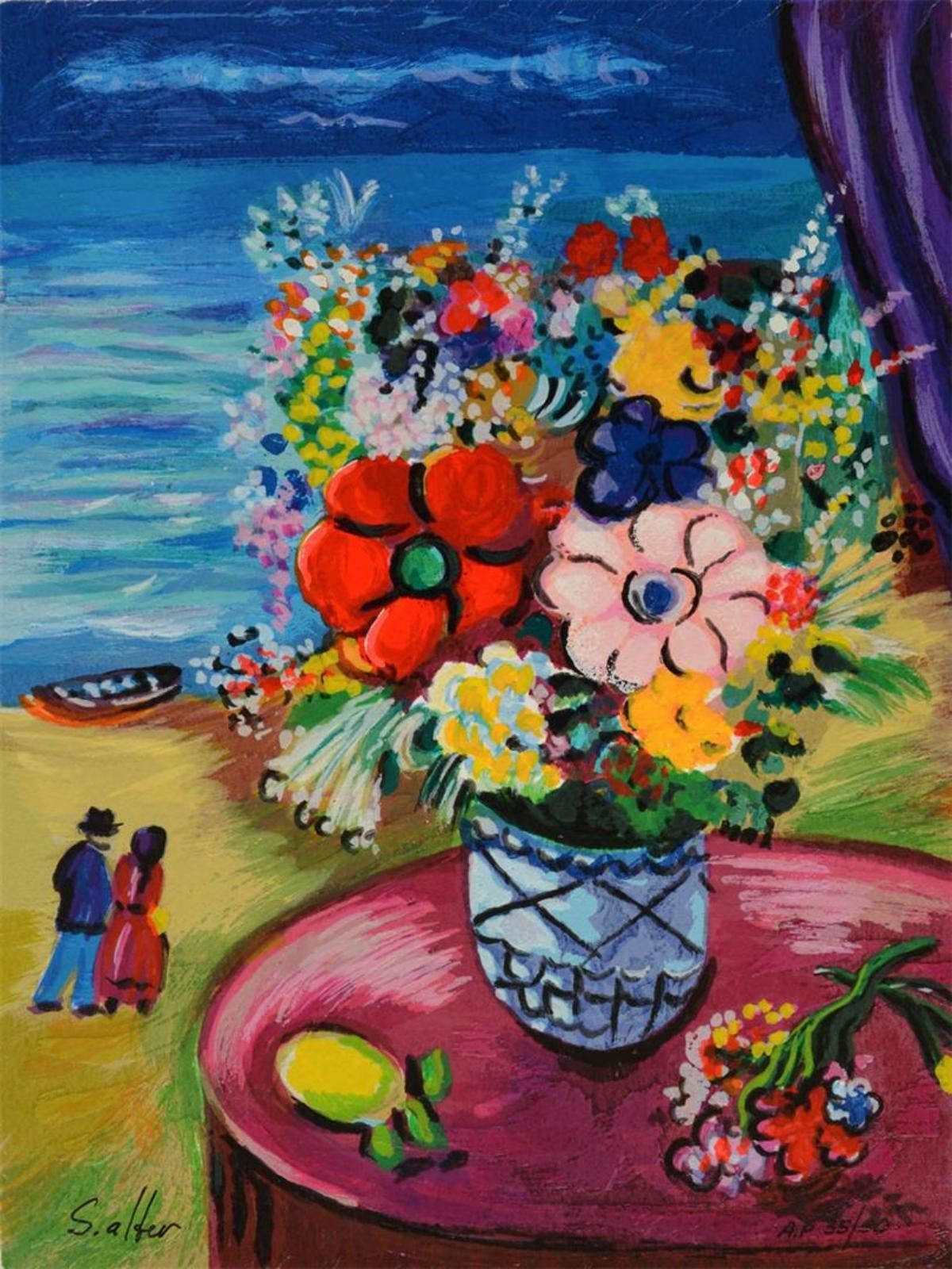 Artist: Shlomo Alter - Title: Early Morning Bouquet - Medium: Serigraph on Fine Art Paper - Signature: Hand-signed by the Artist - Limited Edition: AP 50 - Paper Size: Approximately 12 inches x 9 inches - Framed: Unframed - Details: This work comes with a Certificate of Authenticity - Biography: Shlomo Alter was born in Romania to a family of restaurateurs. He emigrated to Israel in 1948 and during high school he started to study painting under the well known artist Aaron Avni. Some of his early works appeared in UNICEF'S world touring exhibition of young artists. Altar's works are influenced by his early recollections of the well dressed people who gathered in the courtyard of his parent's restaurant in Bucharest to eat and drink, to dance of Gypsy bands, and to enjoy the convivial atmosphere. With a touch of optimism and good humor Alter's art reflects life at its core, an antithesis to the Nazi regime that shattered his childhood happiness. His paintings are like stage set on which the objects relate to each other through a glow of colors and lines - a frozen moment in time, a dynamic stillness prior to a burst of action. His style can best be compared to that of the Expressionists. He uses color to give direct expression to his ideas in influence by the famous, particularly Matisse and Duty.