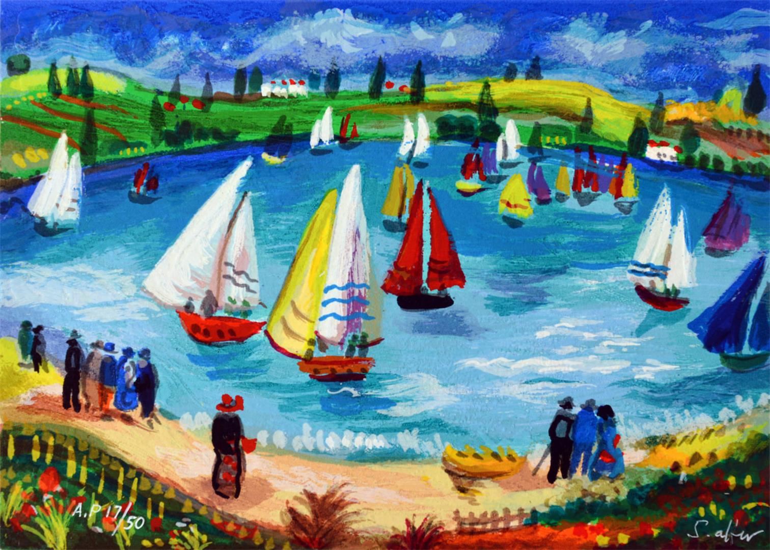 Artist: Shlomo Alter - Title: Sailing - Medium: Serigraph on Fine Art Paper - Signature: Hand-signed by the Artist - Limited Edition: AP 50 - Paper Size: Approximately 8.5 inches x 10.5 inches - Unframed - Details: This work comes with a Certificate of Authenticity - Biography: Shlomo Alter was born in Romania to a family of restaurateurs. He emigrated to Israel in 1948 and during high school he started to study painting under the well known artist Aaron Avni. Some of his early works appeared in UNICEF'S world touring exhibition of young artists. Altar's works are influenced by his early recollections of the well dressed people who gathered in the courtyard of his parent's restaurant in Bucharest to eat and drink, to dance of Gypsy bands, and to enjoy the convivial atmosphere. With a touch of optimism and good humor Alter's art reflects life at its core, an antithesis to the Nazi regime that shattered his childhood happiness. His paintings are like stage set on which the objects relate to each other through a glow of colors and lines - a frozen moment in time, a dynamic stillness prior to a burst of action. His style can best be compared to that of the Expressionists. He uses color to give direct expression to his ideas in influence by the famous, particularly Matisse and Duty.