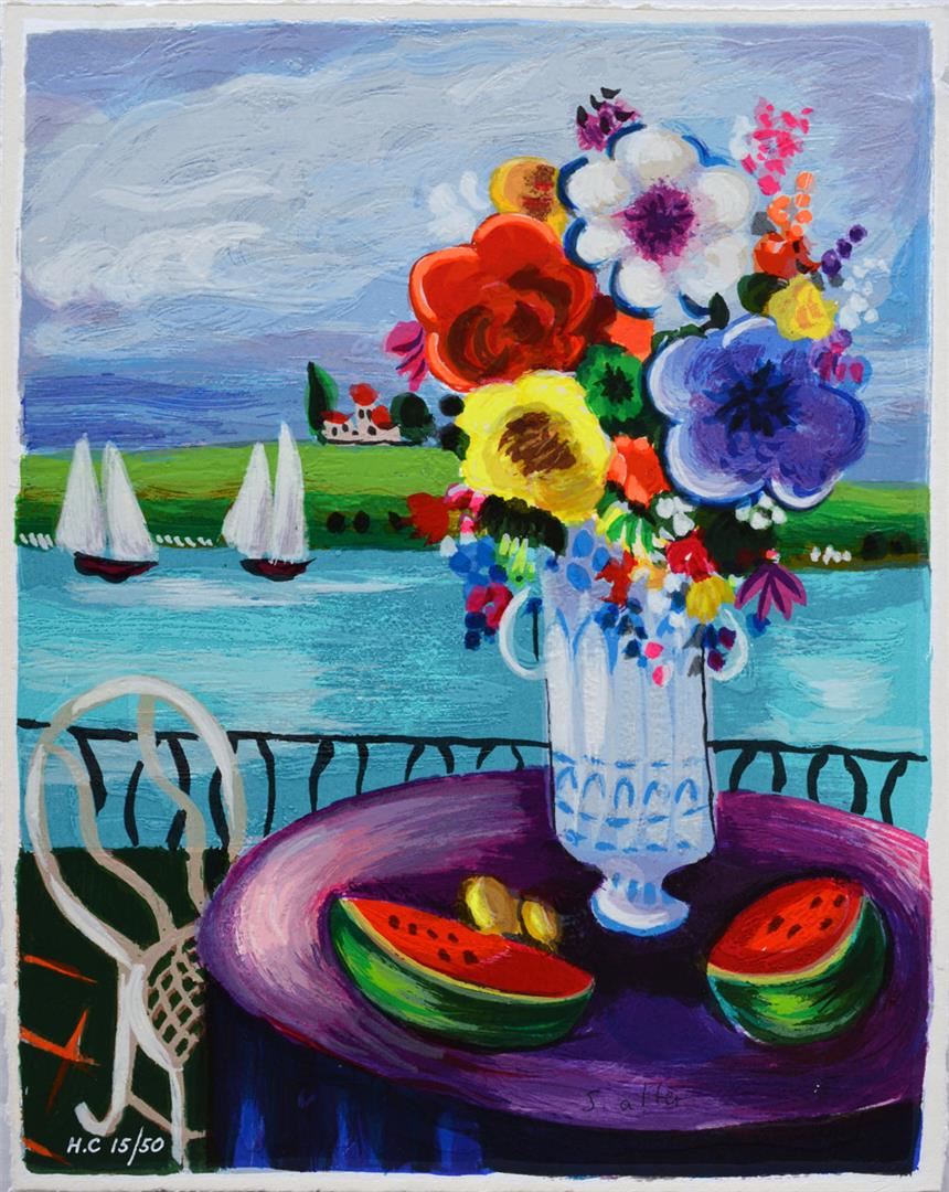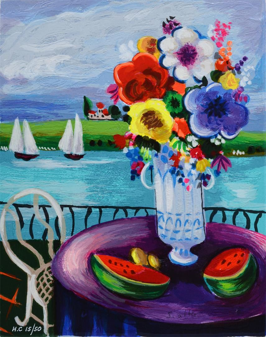 Artist: Shlomo Alter - Title: Summer Day - Medium: Serigraph on Fine Art Paper - Signature: Hand-signed by the Artist - Limited Edition: HC 50 - Paper Size: Approximately 11.5 inches x 9 inches - Unframed - Details: This work comes with a Certificate of Authenticity - Biography: Shlomo Alter was born in Romania to a family of restaurateurs. He emigrated to Israel in 1948 and during high school he started to study painting under the well known artist Aaron Avni. Some of his early works appeared in UNICEF'S world touring exhibition of young artists. Altar's works are influenced by his early recollections of the well dressed people who gathered in the courtyard of his parent's restaurant in Bucharest to eat and drink, to dance of Gypsy bands, and to enjoy the convivial atmosphere. With a touch of optimism and good humor Alter's art reflects life at its core, an antithesis to the Nazi regime that shattered his childhood happiness. His paintings are like stage set on which the objects relate to each other through a glow of colors and lines - a frozen moment in time, a dynamic stillness prior to a burst of action. His style can best be compared to that of the Expressionists. He uses color to give direct expression to his ideas in influence by the famous, particularly Matisse and Duty.