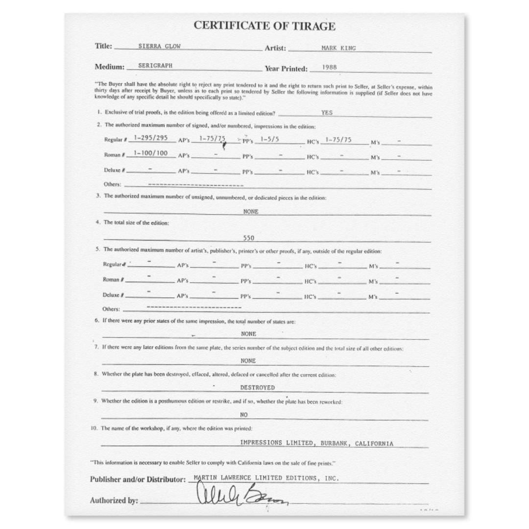 "Sierra Glow" is a limited edition serigraph on paper by Mark King (1931-2014). Hand signed and numbered, this piece comes with a letter of authenticity and measures approximately 28" x 37" (image).