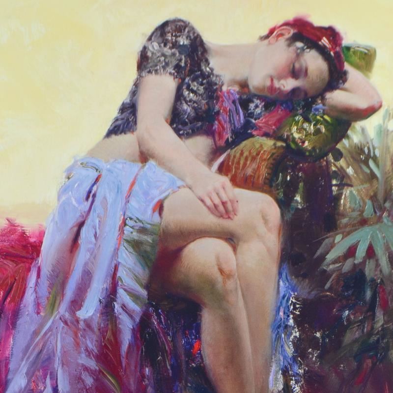 Pino's portraits allow glimpses into intensely personal, intimate spaces, conveying emotion through rich, warm color and sensual brushwork. "Siesta" is an artist-embellished limited edition giclee on canvas by Pino (1939-2010). The piece is numbered, hand signed, and includes certificate of authenticity. Measures approximately 34" x 34" (image).