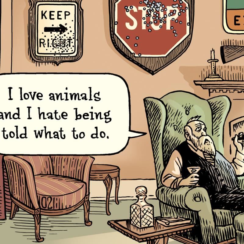 "Sign Hunter" is a limited edition giclee on paper by Dan Piraro, creator of the critically acclaimed and award winning comic strip, Bizarro! This piece is numbered and hand signed by the artist and includes aletterof authenticity. Measures approximtely 8" x 15" (image).