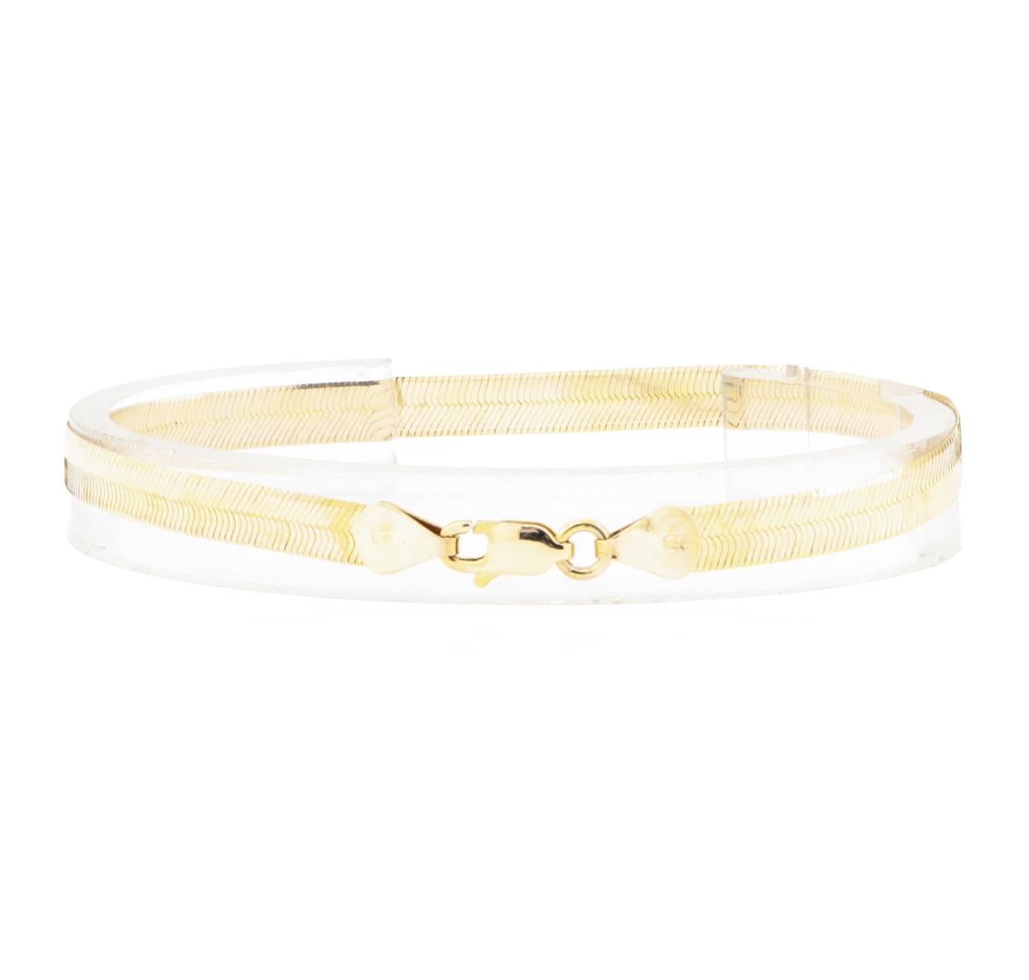 One silk herringbone chain bracelet measuring approximately seven inches in length and 5mm in width featuring: 10KT yellow gold weighing 3.3 grams.