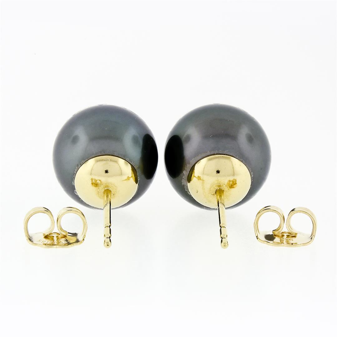 A solid 18k yellow gold stud earrings, with 2 round shape natural tahitian pearls (10.75mm and 10.90mm). The earrings measure approximately 10.75mm to 10.90mm in diameter and weigh a total of 4.51 grams.