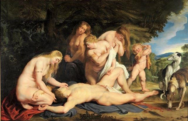 Artist: Sir Peter Paul Rubens - Title: The Death of Adonis - Medium: Fine Art Reproduction Giclee on Canvas - Image Size: Approximately 20.75 inches x 32 inches - Unframed on Unstretched Canvas - Biography: Sir Peter Paul Rubens (28 June 1577 - 30 May 1640) was a Flemish artist and diplomat from the Duchy of Brabant in the Southern Netherlands (modern-day Belgium) who lived during the Dutch Golden Age. He is considered the most influential artist of the Flemish Baroque tradition. Sir Peter Paul Rubens's highly charged compositions reference erudite aspects of classical and Christian history. His unique and immensely popular Baroque style emphasized movement, colour, and sensuality, which followed the immediate, dramatic artistic style promoted in the Counter-Reformation. Sir Peter Paul Rubens was a painter producing altarpieces, portraits, landscapes, and history paintings of mythological and allegorical subjects. He was also a prolific designer of cartoons for the Flemish tapestry workshops and of frontispieces for the publishers in Antwerp.