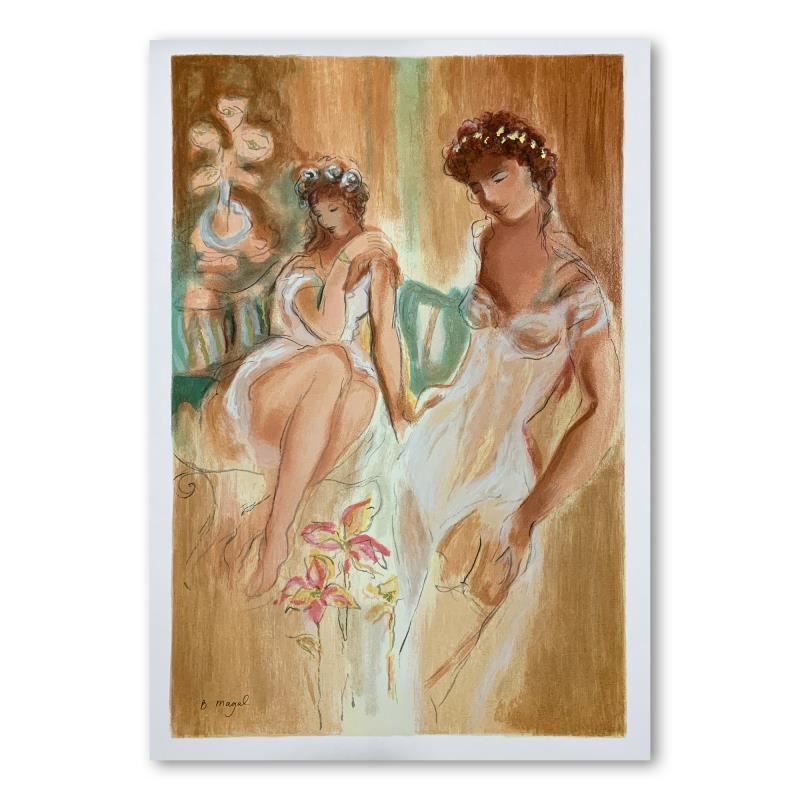 "Sister" is a limited edition serigraph on paper by Batia Magal. It is numbered and hand signed and includes a letter of authenticity. Measures approximately 19" x 29.5" (image).