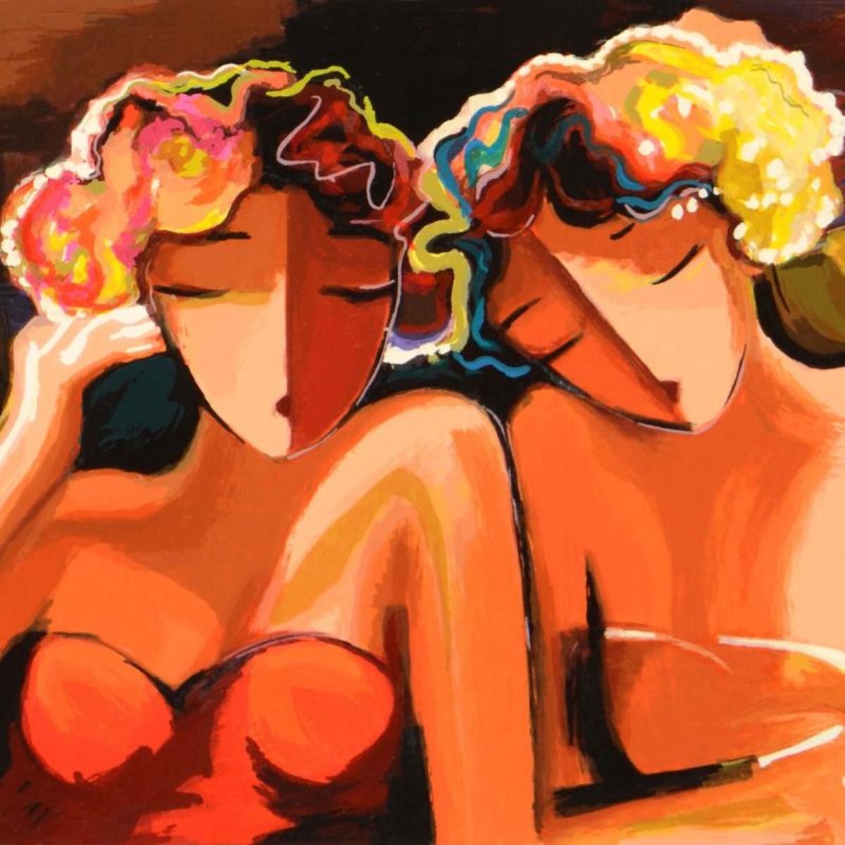 "Sisters" is a limited edition serigraph on paper, numbered and hand signed by Michael Kerzner. Includes Certificate of Authenticity. Measures approx. 24.5" x 11.5" (with border); 23" x 10" (image).