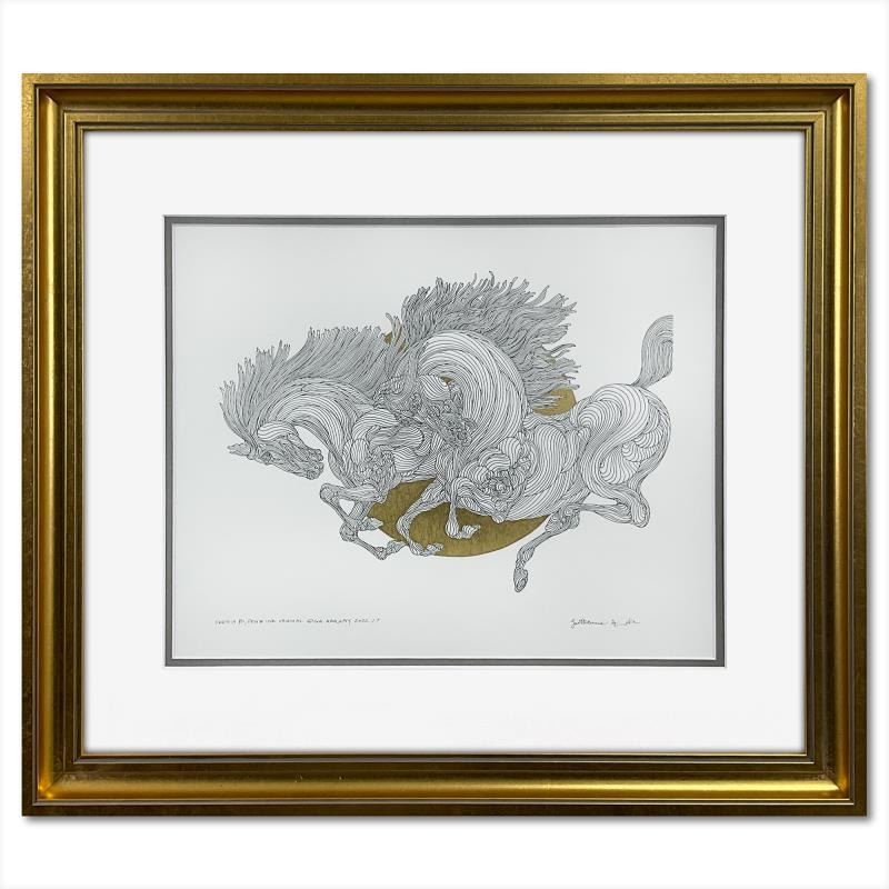 "Sketch B" is an original pen and ink drawing on paper with hand laid goldleaf by Guillaume Azoulay, hand signed by the artist. This piece comes custom framed. Includes Letter of Authenticity. Measures approx. 24" x 24" (frame), 15" x 12" (image).