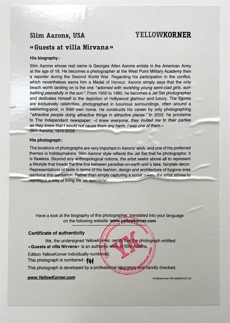 Slim Aaron USA Guest At Villa Nirvana YellowKorner Certified Photograph. Certificate of Authenticity from YellowKorner affixed to the back. Matted Dimensions 16"x20". Protected with Clear Mylar Sleeve.
