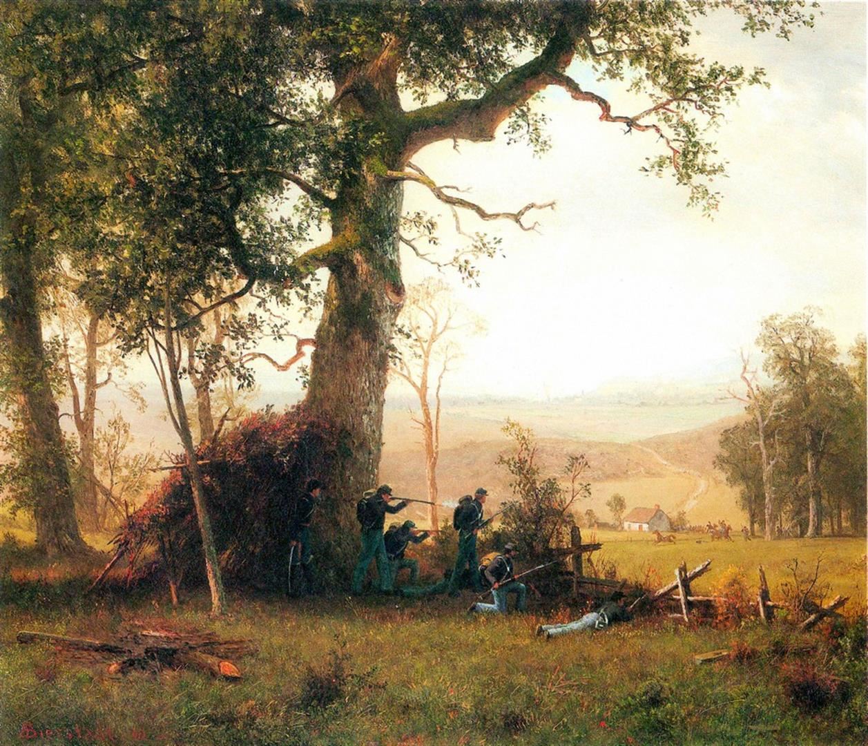 Artist: Albert Bierstadt - Title: Small War, Postal Strick in Virginia - Medium: Fine Art Giclee on Canvas - Image Size: Approximately 17.25 inches x 20 inches - Unframed on Unstretched Canvas - Biography: Bierstadt became internationally renowned for his beautiful and enormous paintings of the newly accessible American west, and his works found their way into public and private collections at staggeringly high prices for his time. His popularity and wealth rose to tremendous heights only to fade as the interest in the Boston School and impressionism turned public taste away from his highly detailed landscapes suffused with golden light. -