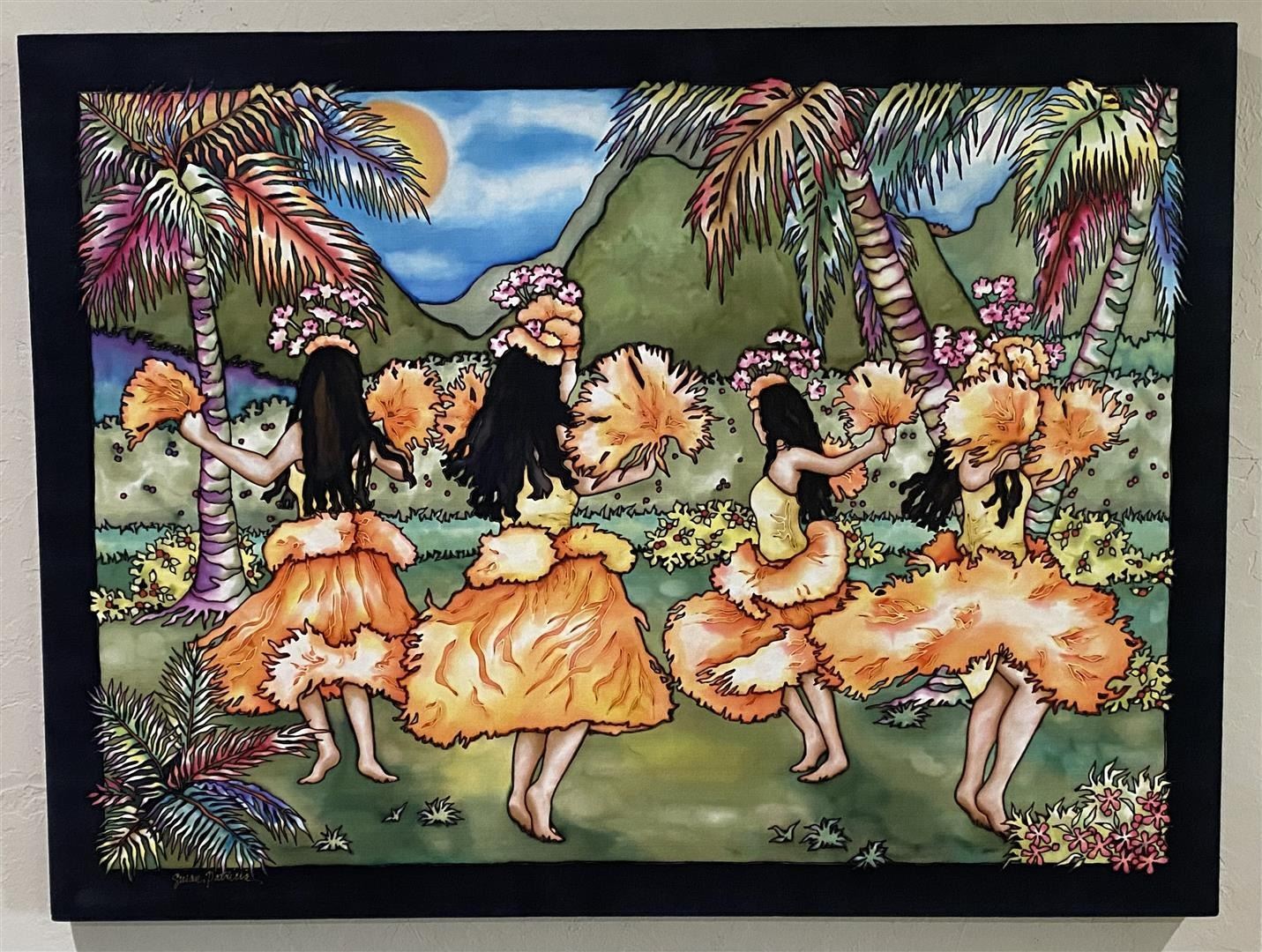 Hawaii's Susan Patricia gives us "So We Dance". A Hula ritual pictured on silk. 40x30" original w/ added texture