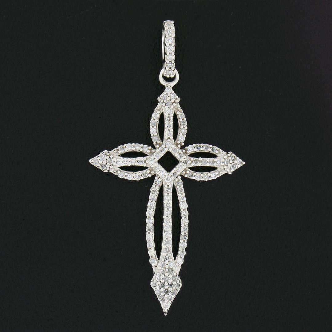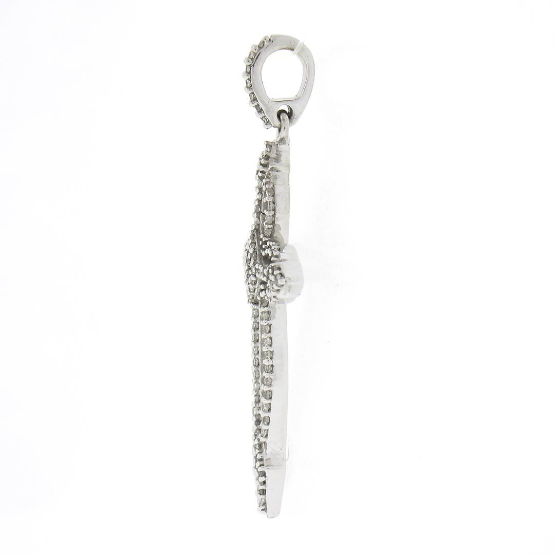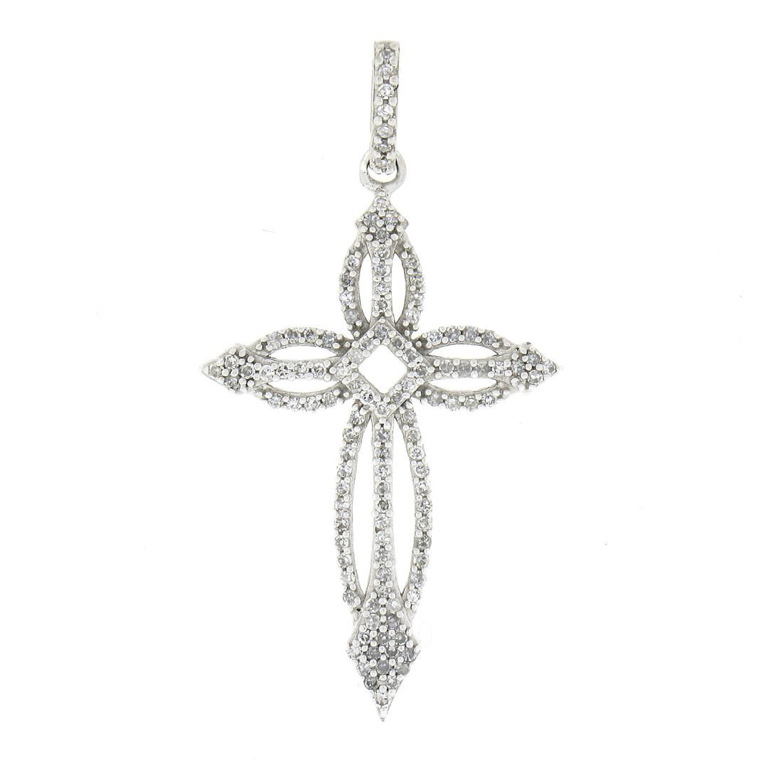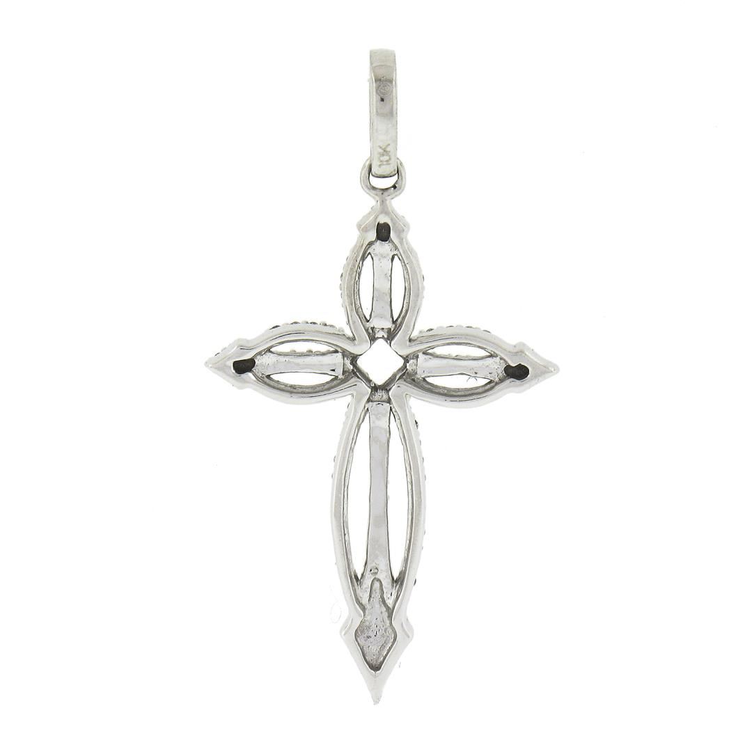 A solid 10k white gold cross pendant, featuring numerous of single cut natural diamonds ( G/H - I1/I2 ; 0.35ctw ). The pendant weighs a total of 1.47 grams, measures 32x17.1mm including the bail, and the inside of the bail measures 2.9x2.6mm.
