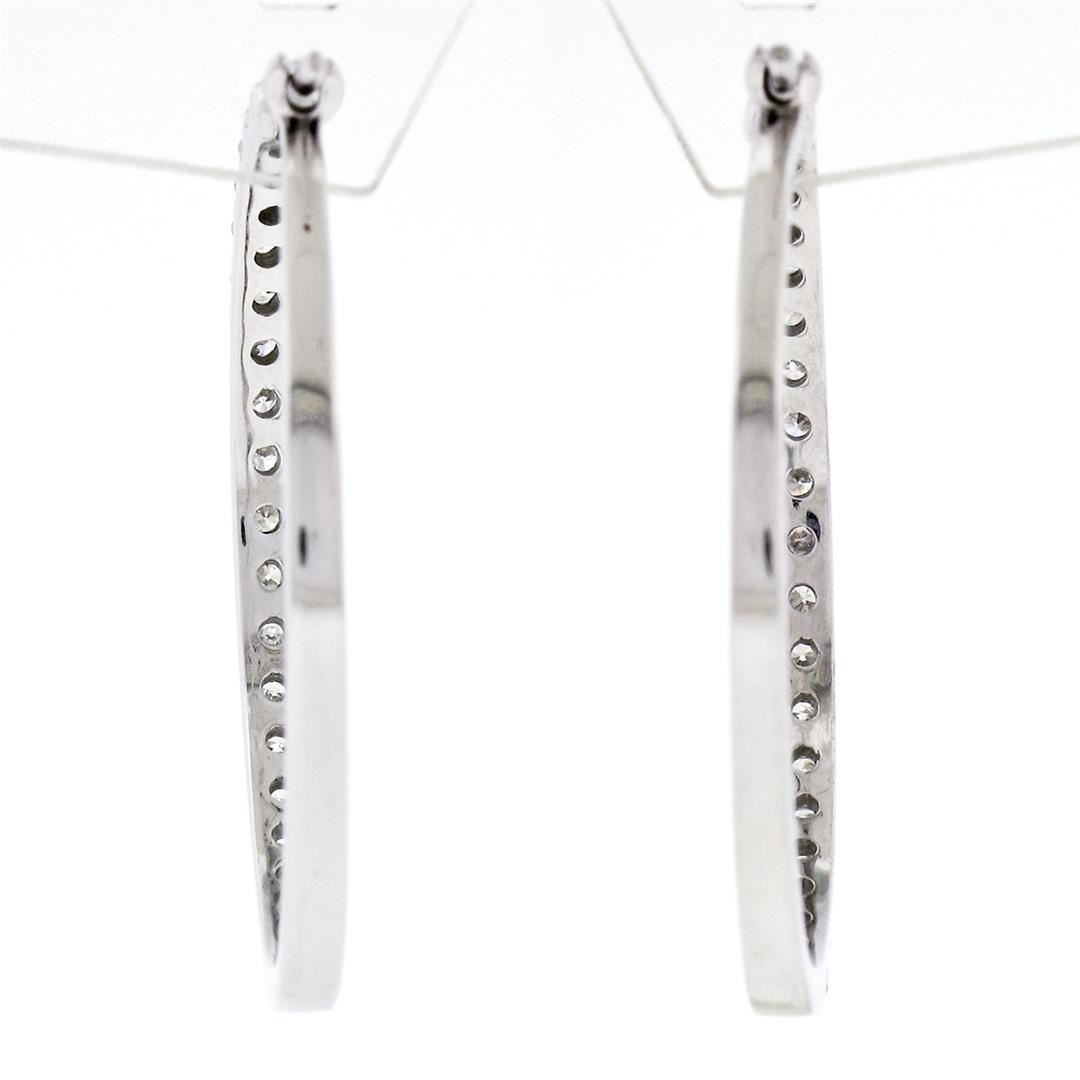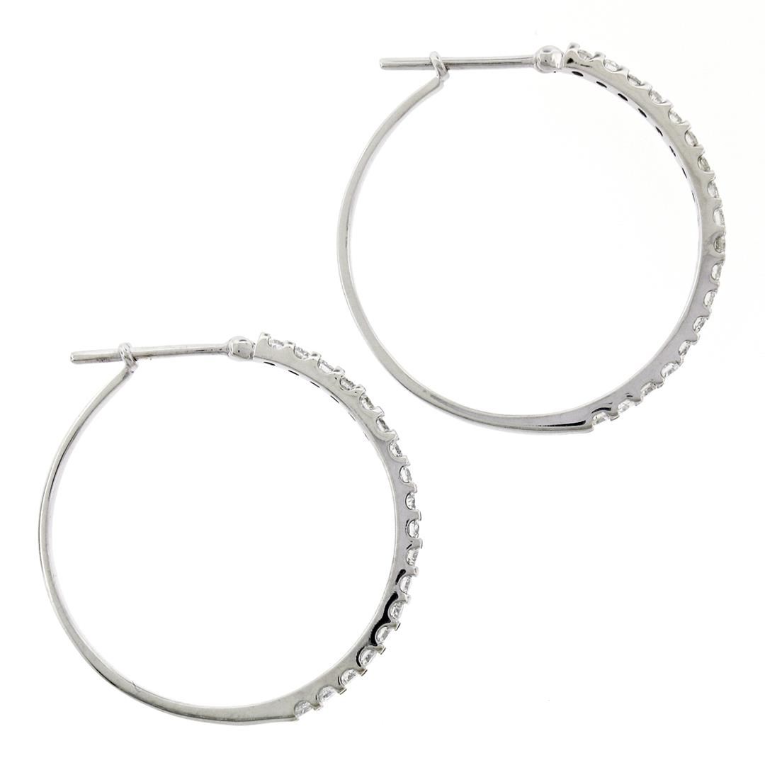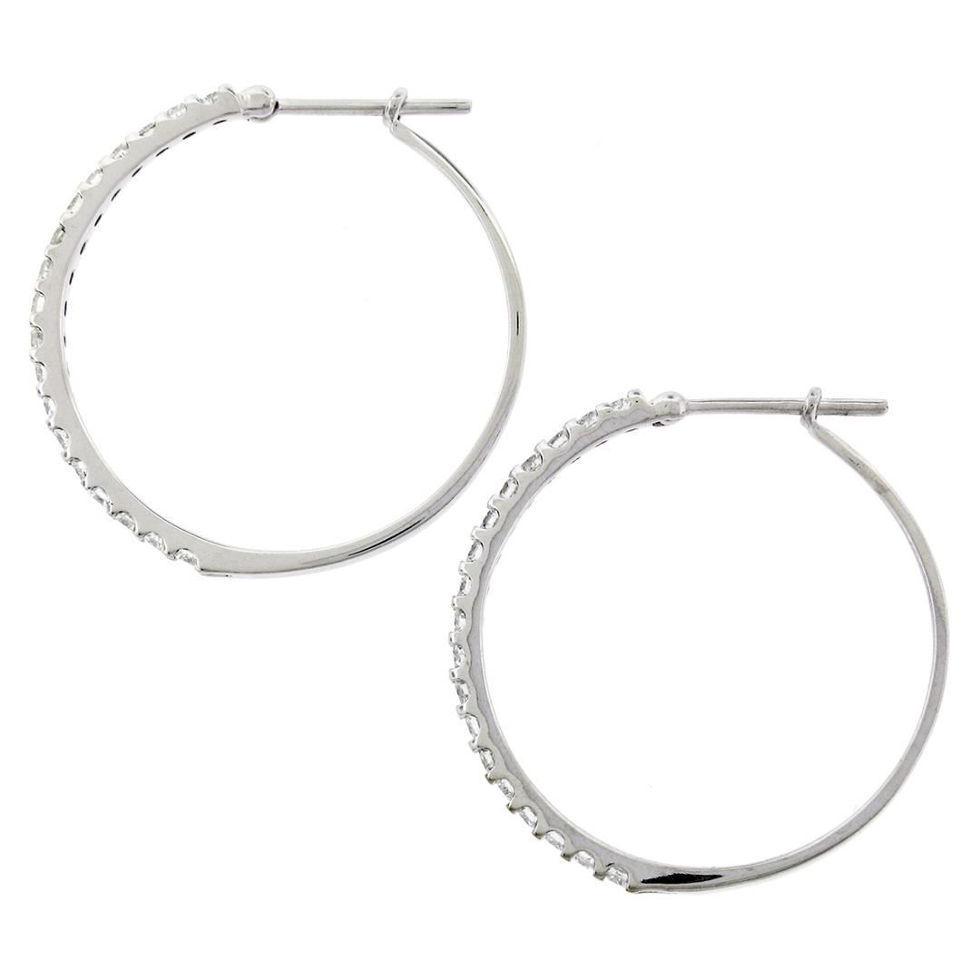 An estate solid 14k white gold hoop earrings, with 36 round brilliant cut natural diamonds (G/H- VS2/SI1; 1.50ctw). The earrings measure approximately 32.0x2.40mm and weigh a total of 6.08 grams.