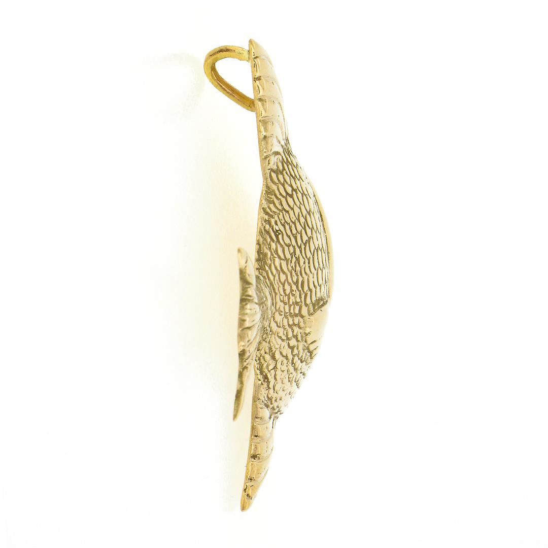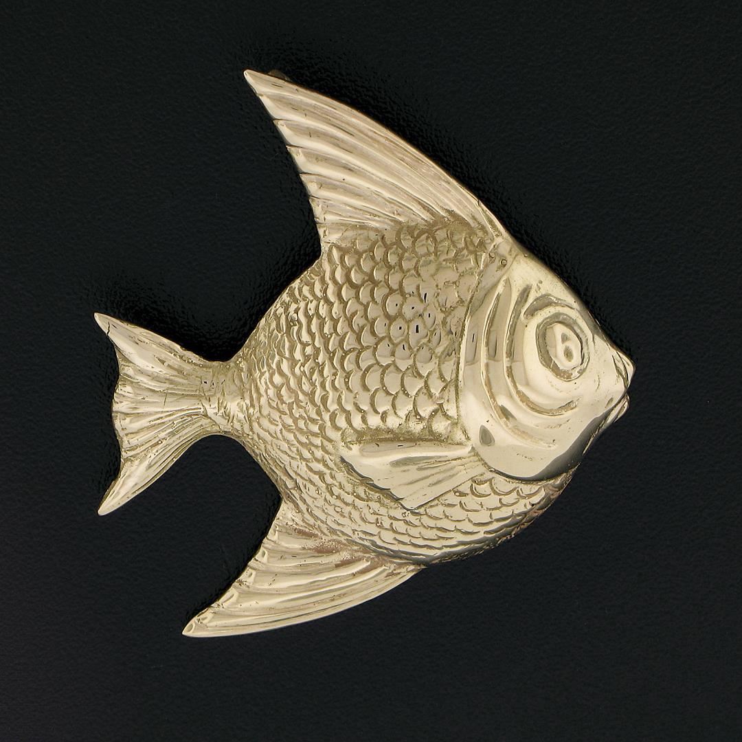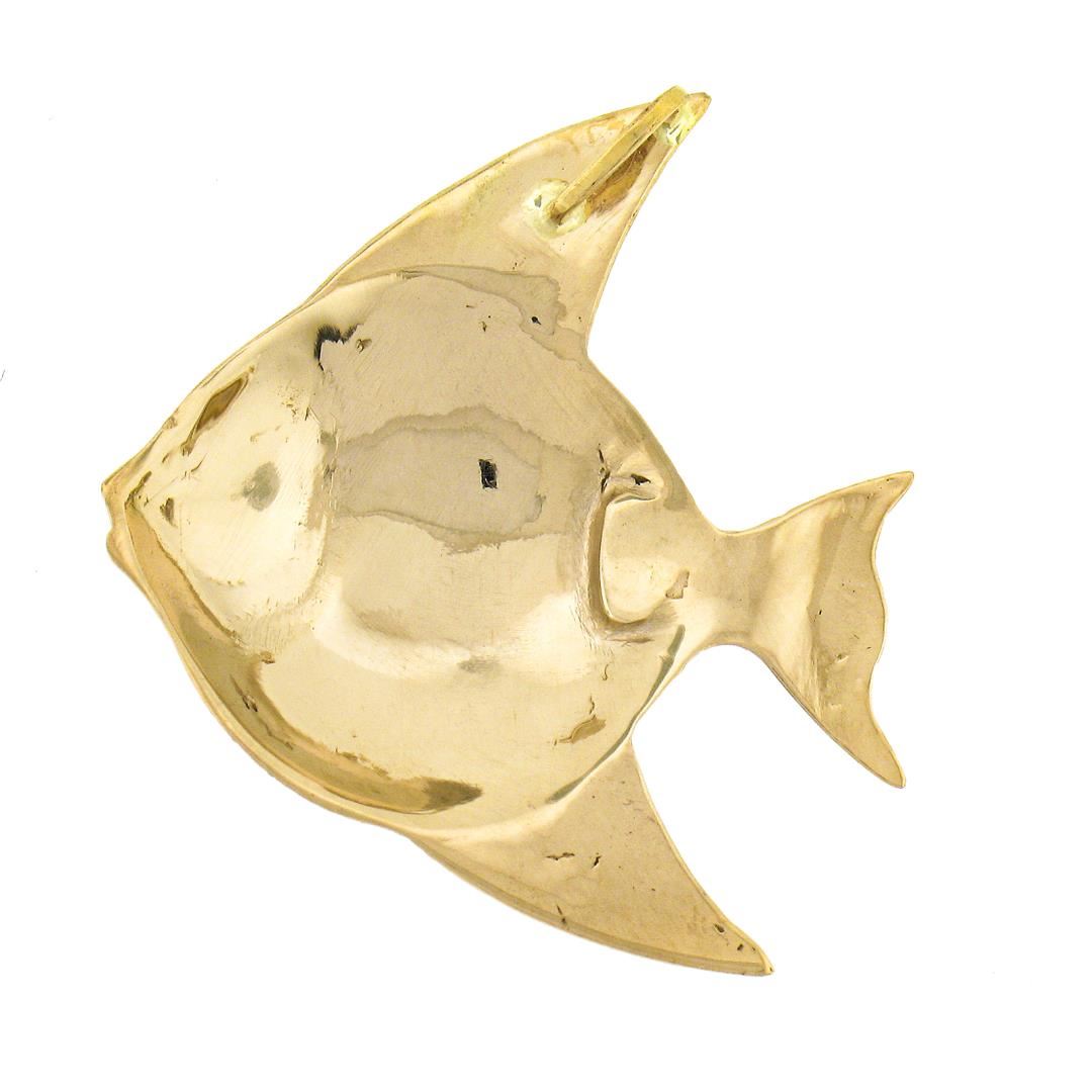 A solid 14k yellow gold fish charm pendant. The pendant weighs a total of 4.75 grams, measures 34.60x31.30mm including the bail, and the inside of the bail measures 4.3x2.7mm.