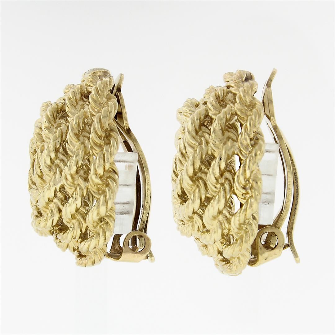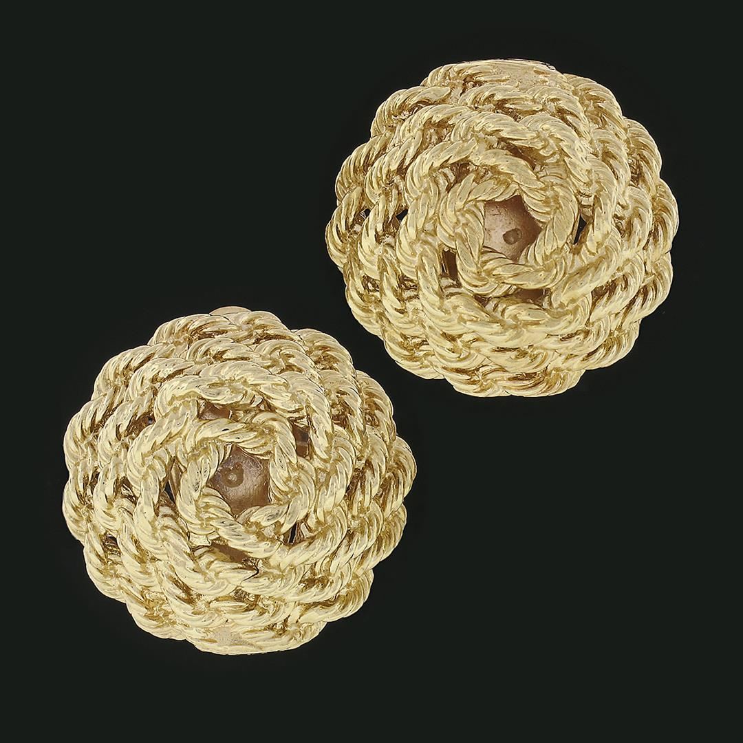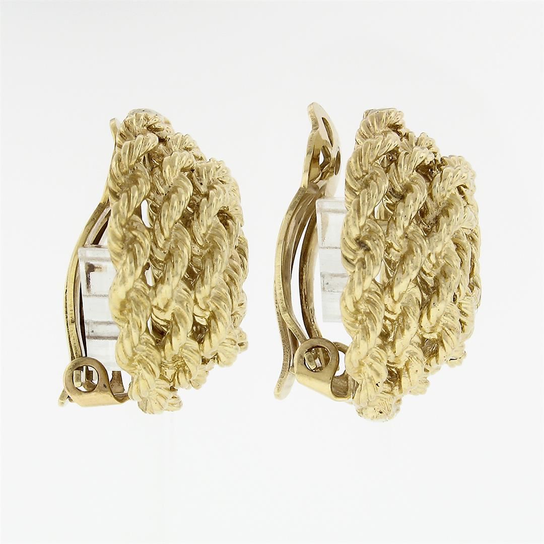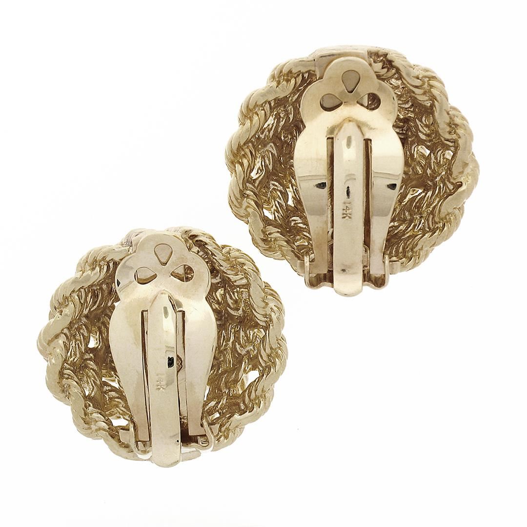 A solid 14k yellow gold rope wrap button clip on pair of earrings. The earrings measure approximately 23mm in diameter and weigh a total of 21.80 grams.