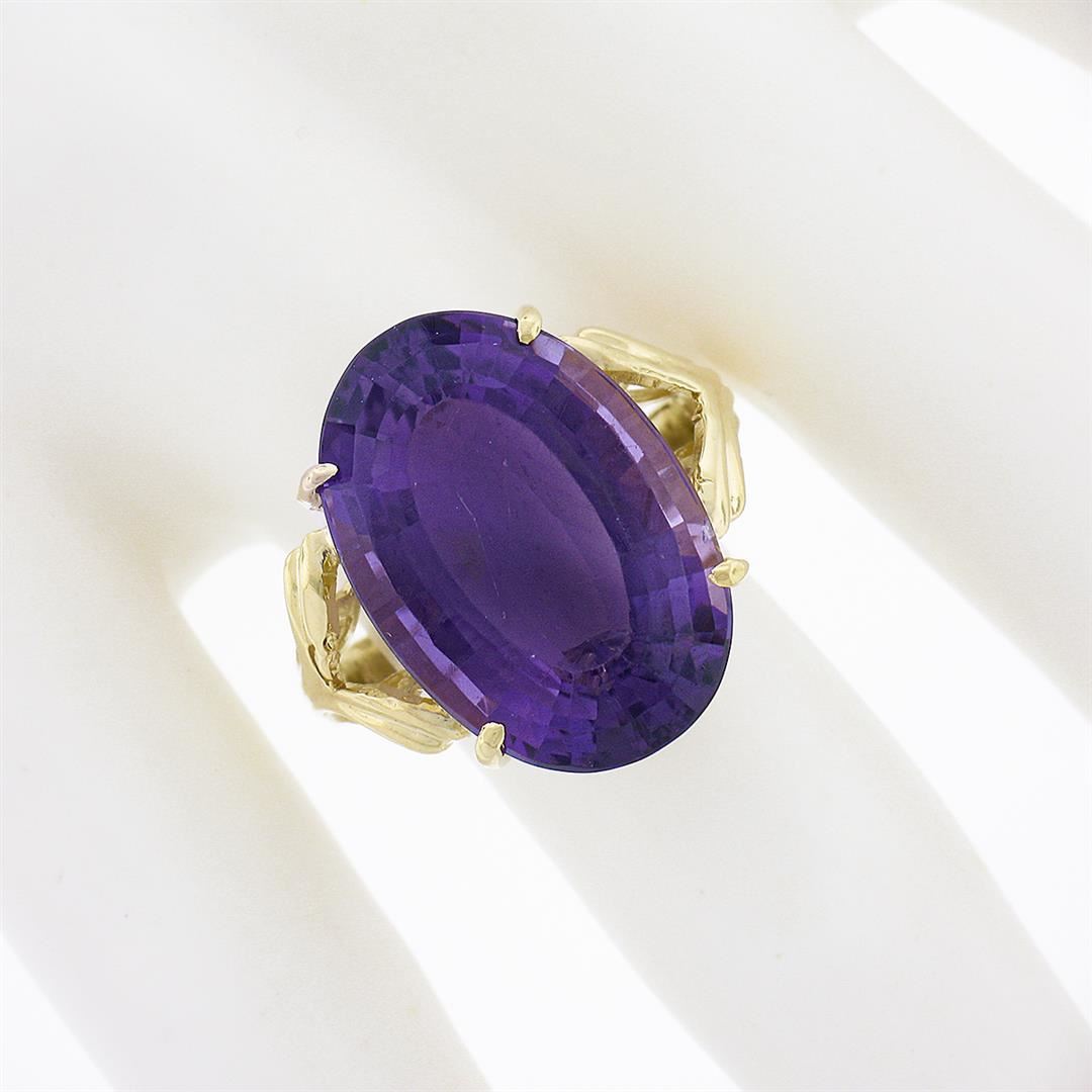 A solid 14k yellow gold solitaire ring, with 1 oval cut natural amethyst (19.5x13.3mm - 15ct).The ring is size 7.5, weighs a total of 7.48 grams, and measures 19.50mm wide.