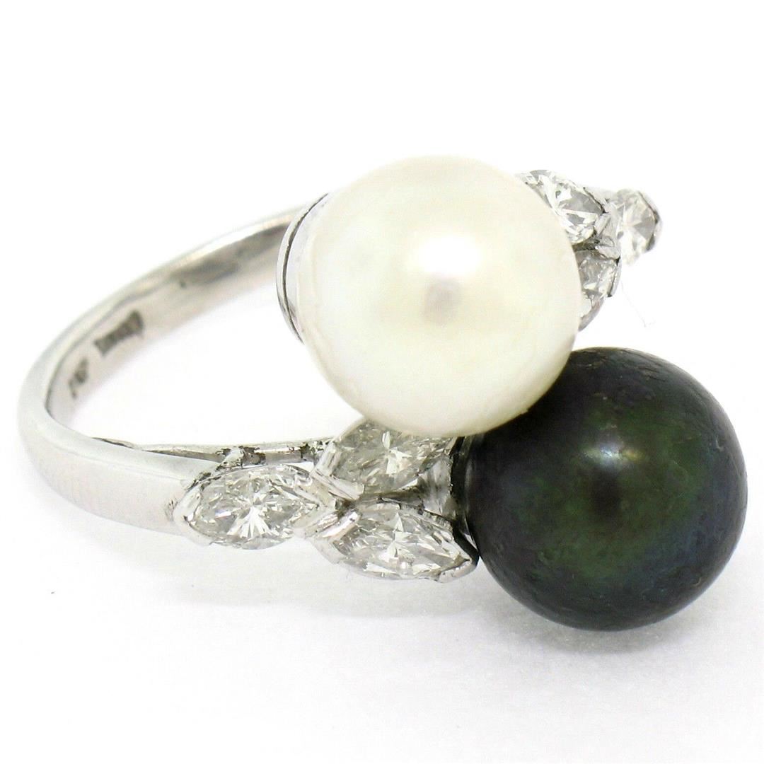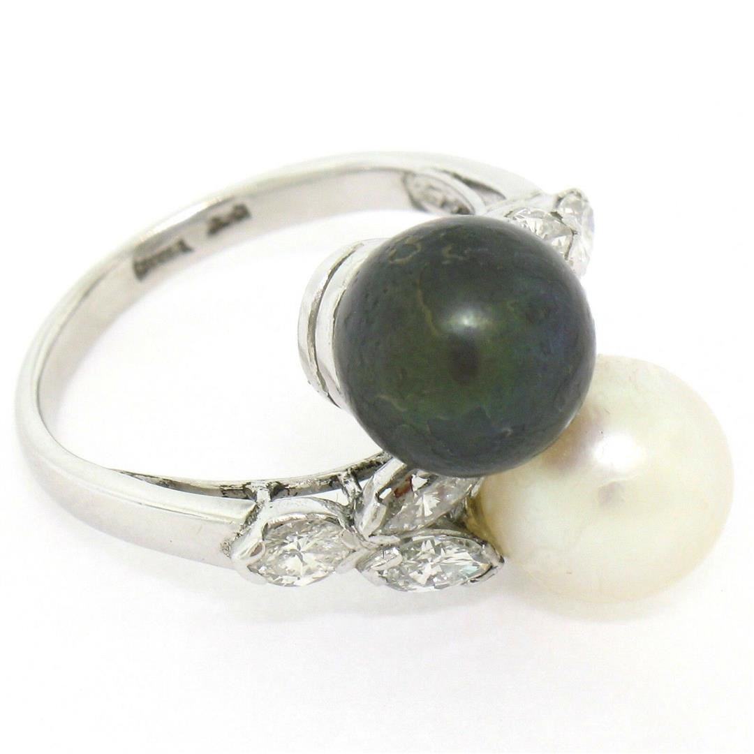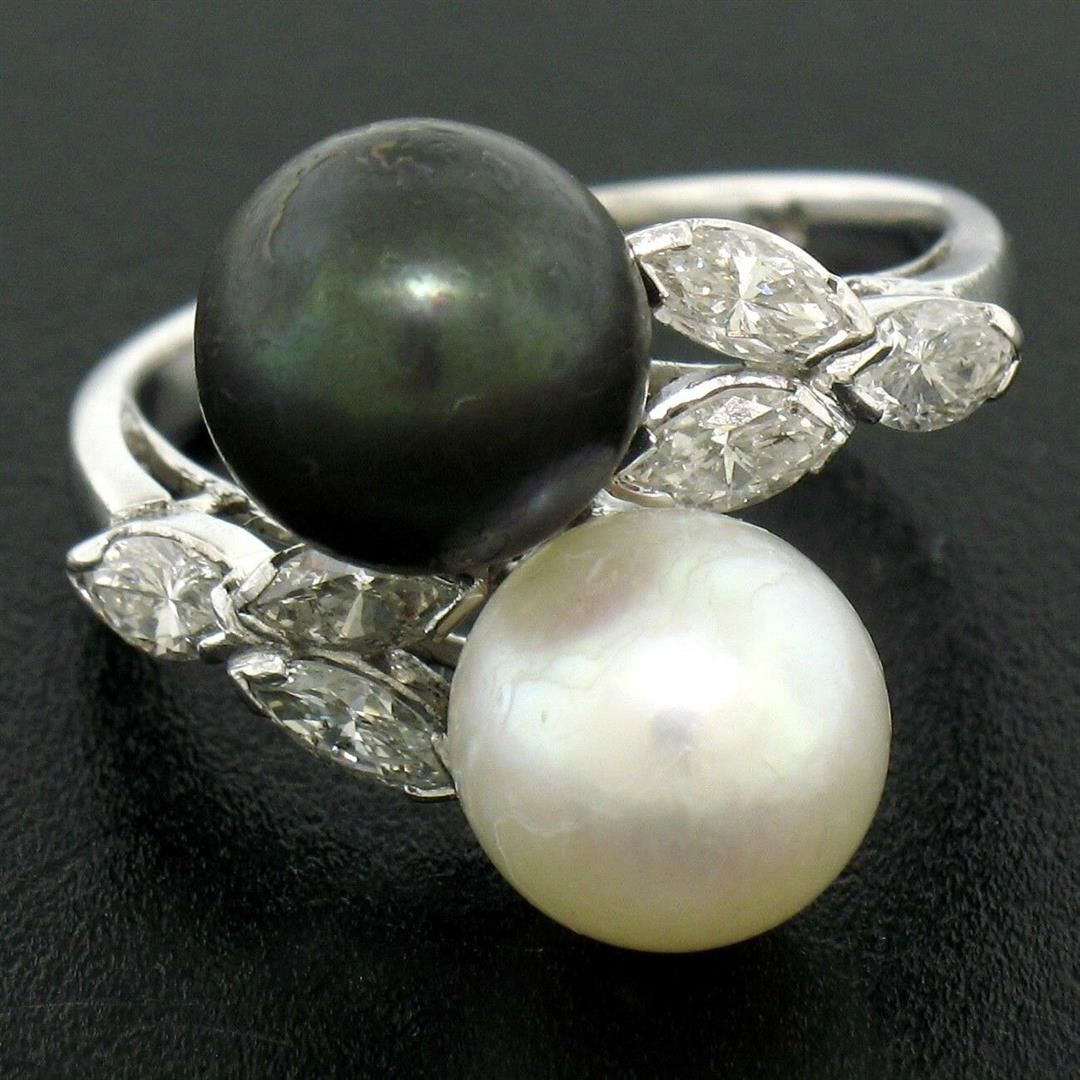 One Solid Platinum Cultured Tahitian Black Pearl .36ctw Diamond Bypass Cocktail Ring. Item Details: Material: Solid .950 Platinum, Weight: 6.67 Grams, Stone(s): (1) Cultured Tahitian Pearl - Round Shape - Stem Set - Beautiful Black Color - 8.64mm (approx.), (1) Cultured Akoya Pearl - Round Shape - Stem Set - Ivory Color w/ Beautiful Luster and Pink Overtones - 8.40mm (approx.), (6) Natural Genuine Diamonds - Marquise Cut - Prong Set - VS1/SI1 Clarity - F/G Color - 0.36ctw (approx.), Ring Size: 5.0 , Ring Width: 17.15mm, Ring Height: 10.30mm rise off the finger Condition: The pearls' surfaces are a little worn. Excellent overall, ready to wear condition!