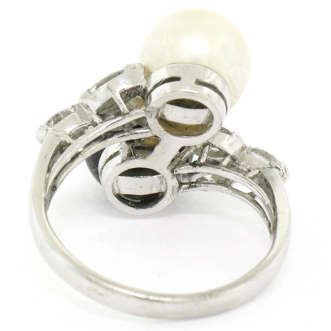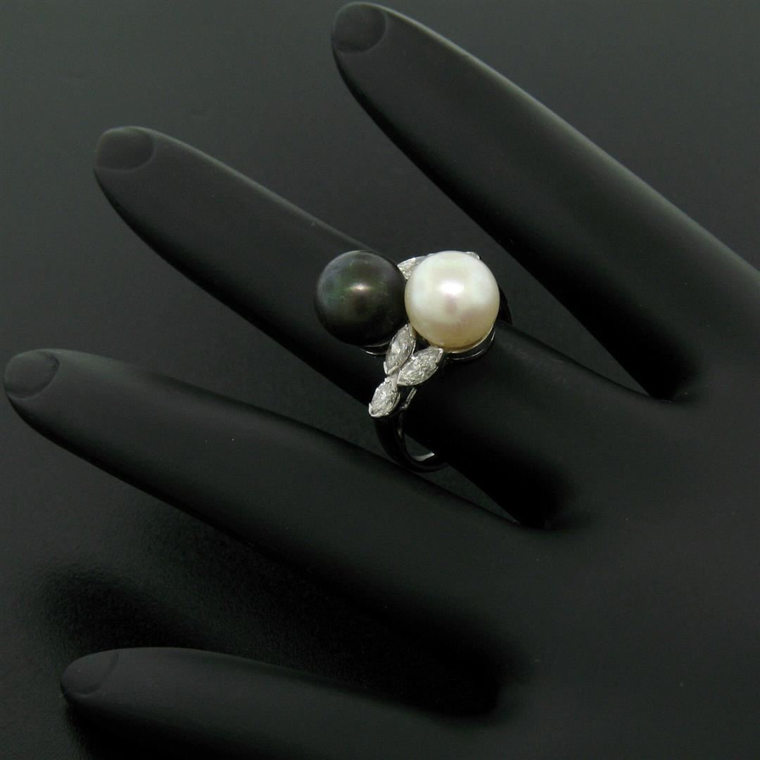 One Solid Platinum Cultured Tahitian Black Pearl .36ctw Diamond Bypass Cocktail Ring. Item Details: Material: Solid .950 Platinum, Weight: 6.67 Grams, Stone(s): (1) Cultured Tahitian Pearl - Round Shape - Stem Set - Beautiful Black Color - 8.64mm (approx.), (1) Cultured Akoya Pearl - Round Shape - Stem Set - Ivory Color w/ Beautiful Luster and Pink Overtones - 8.40mm (approx.), (6) Natural Genuine Diamonds - Marquise Cut - Prong Set - VS1/SI1 Clarity - F/G Color - 0.36ctw (approx.), Ring Size: 5.0 , Ring Width: 17.15mm, Ring Height: 10.30mm rise off the finger Condition: The pearls' surfaces are a little worn. Excellent overall, ready to wear condition!