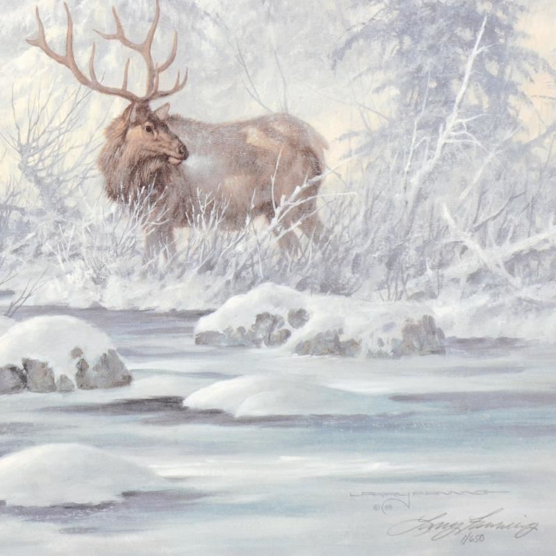 "Solstice Rendezvous - Elk" is a limited edition lithograph on paper by Larry Fanning (1938-2014), numbered and hand signed with a Letter of Authenticity. Measures approximately 32.5" x 20" (image).