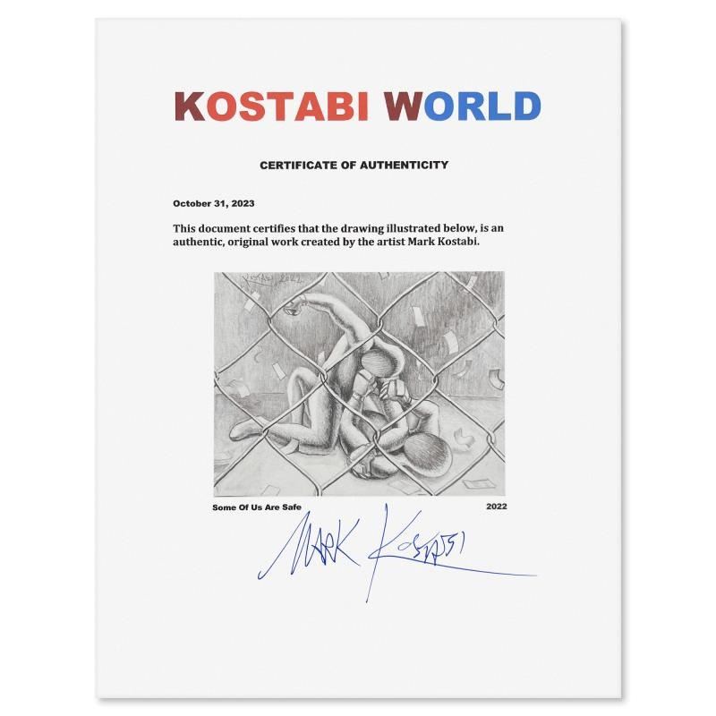 "Some of us are Safe" is an original drawing on paper by Mark Kostabi, hand signed by the artist. This piece comes custom framed and includes a certificate of authenticity. Measures approximately 14.5" x 17" (frame), 8.5" x 11" (image).