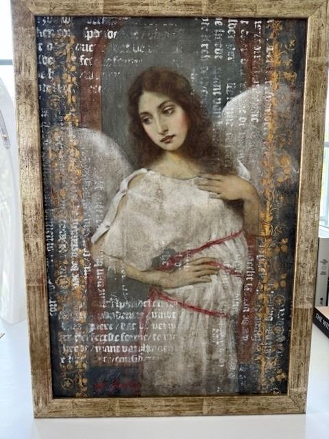 Richard Franklin has an unusual take on an Angel woman against a backdrop of ancient scripture. A 23x15" mixed-media & oil on stretched canvas 30x23Framed
