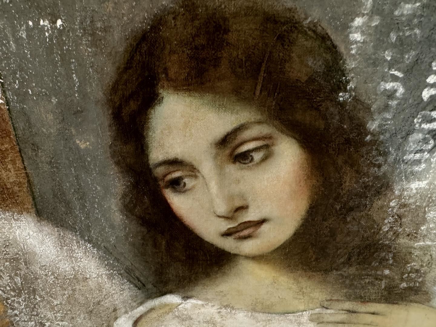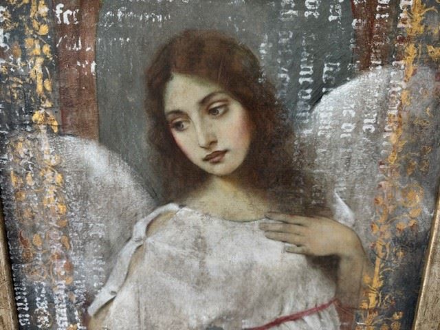 Richard Franklin has an unusual take on an Angel woman against a backdrop of ancient scripture. A 23x15" mixed-media & oil on stretched canvas 30x23Framed