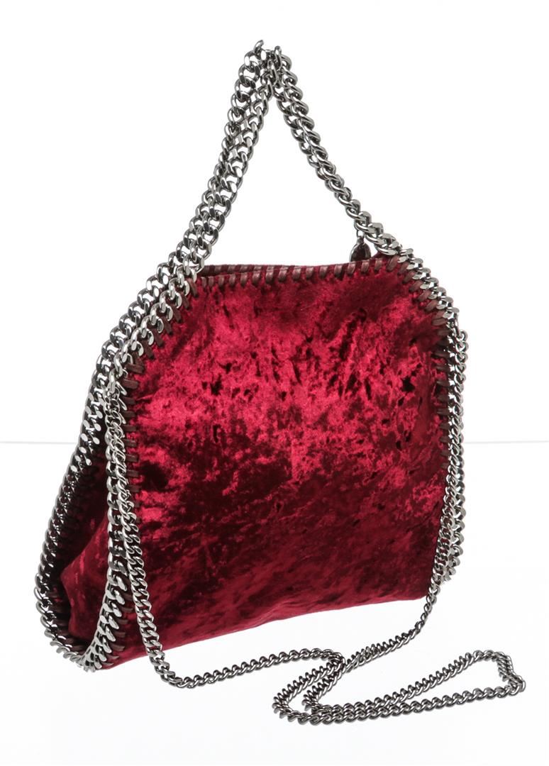 One Stella McCartney Burgundy Velvet Falabella Mini Tote Crossbody Bag. Burgundy velvet Stella McCartney Falabella Mini tote with ruthenium hardware, dual chain-link handles, single chain-link shoulder strap, tonal whipstitched and chain-link trim, black jacquard lining, single slit pocket at interior wall and magnetic snap closure at top.