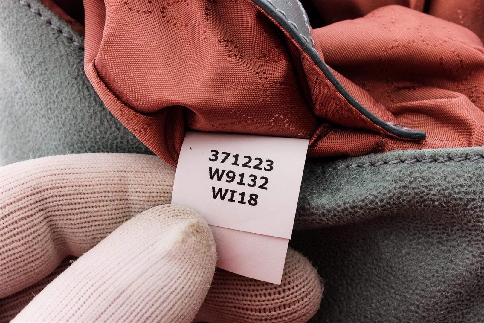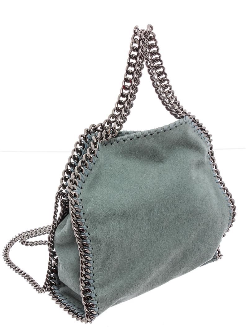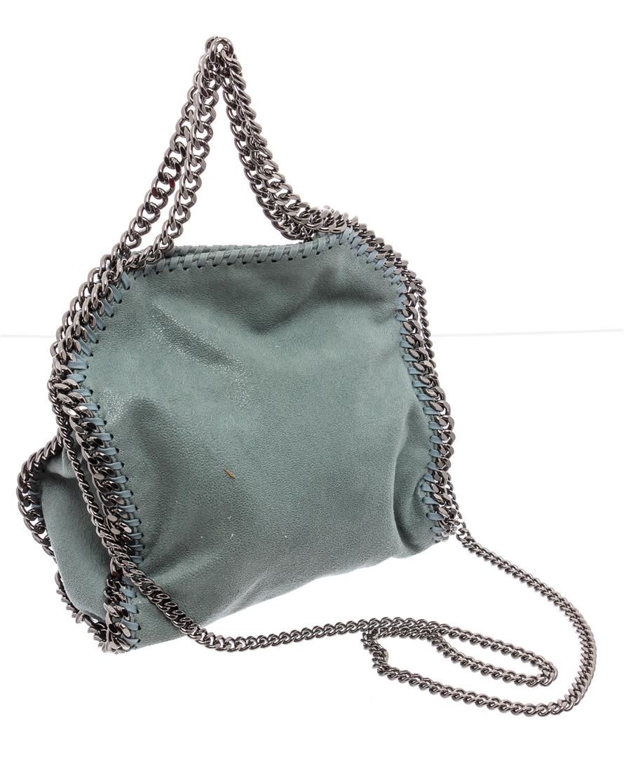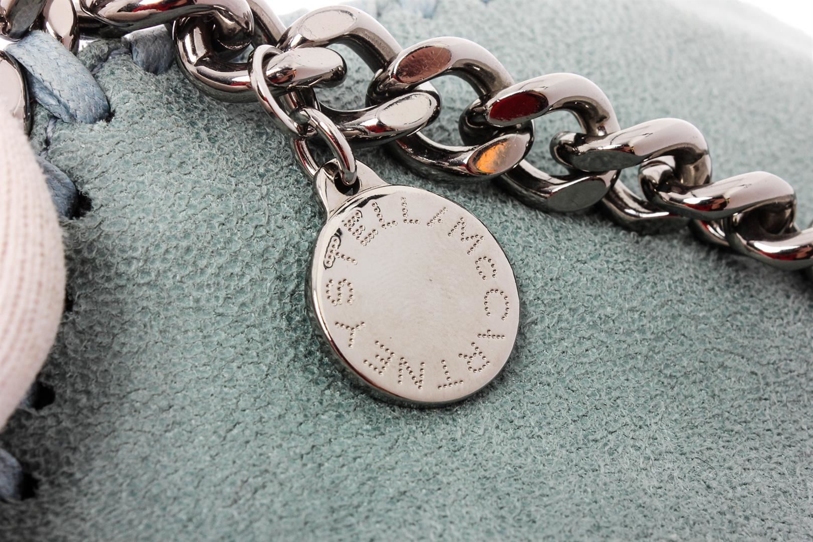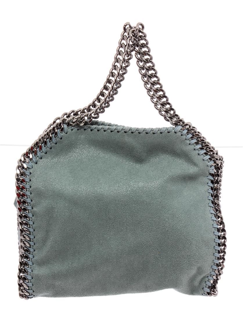 Mint Green Shaggy Deer vegetarian suede Stella McCartney Falabella tote with ruthenium hardware, dual chain-link shoulder straps, chain-light and whipstitch detailing throughout, dark mauve logo jacquard woven lining, single zip pocket at interior wall and magnetic snap closure at top.