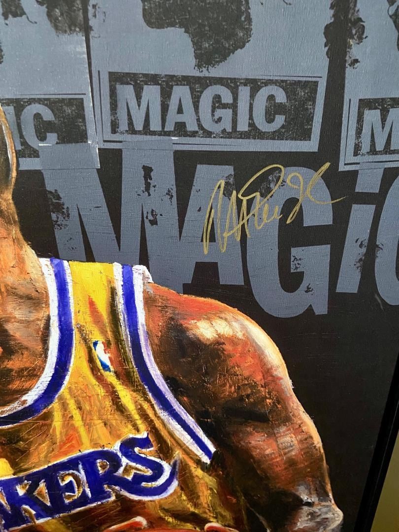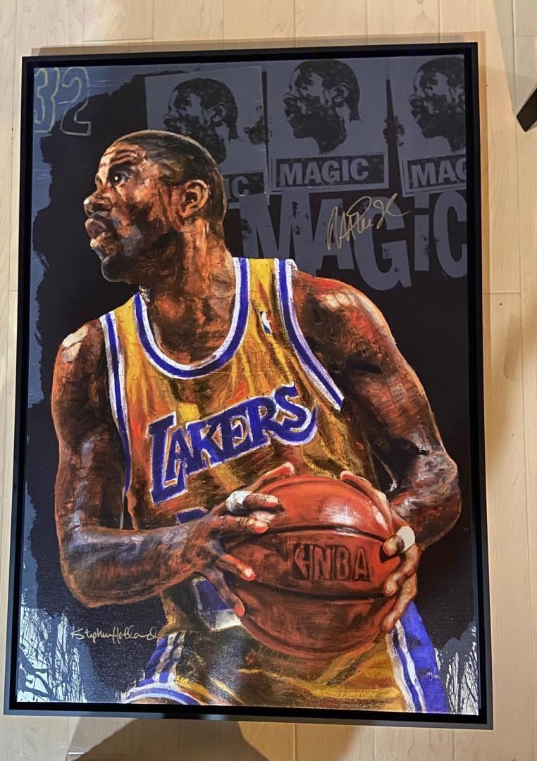 A stretched giclee on canvas , handsigned by the Magic Johnson & by artist Stephen Holland 29.5x42.5" w/ Certificate. Framed .
