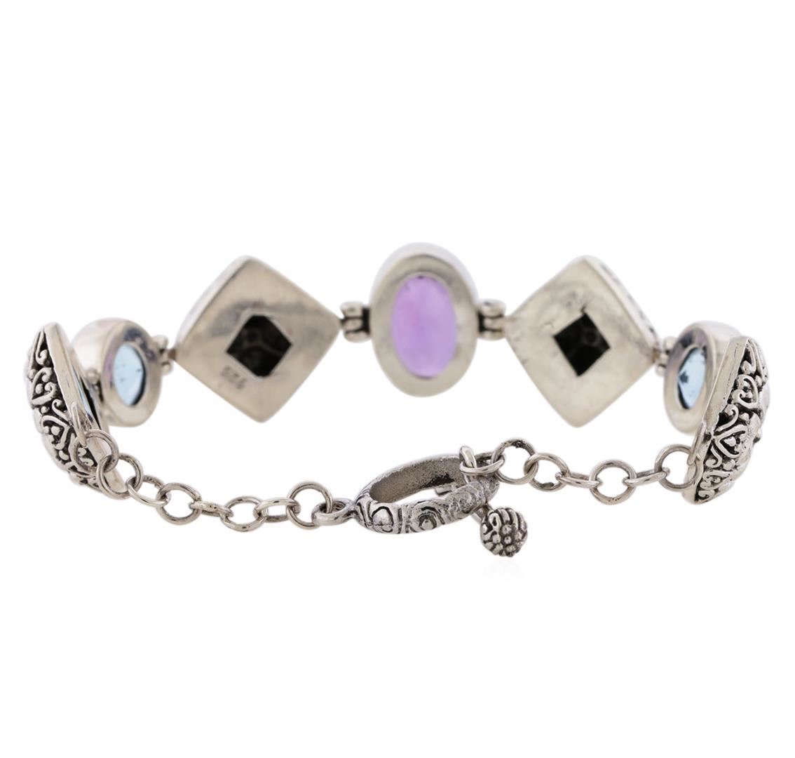 One of a kind high fashion sterling silver Bracelet weighing 18.9 grams. Containing: Amethyst and Blue Topaz. This sterling silver promises a lasting shine.