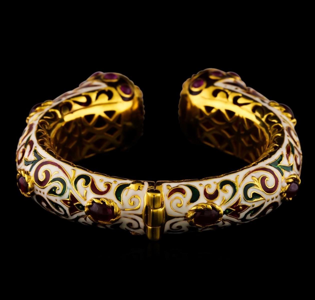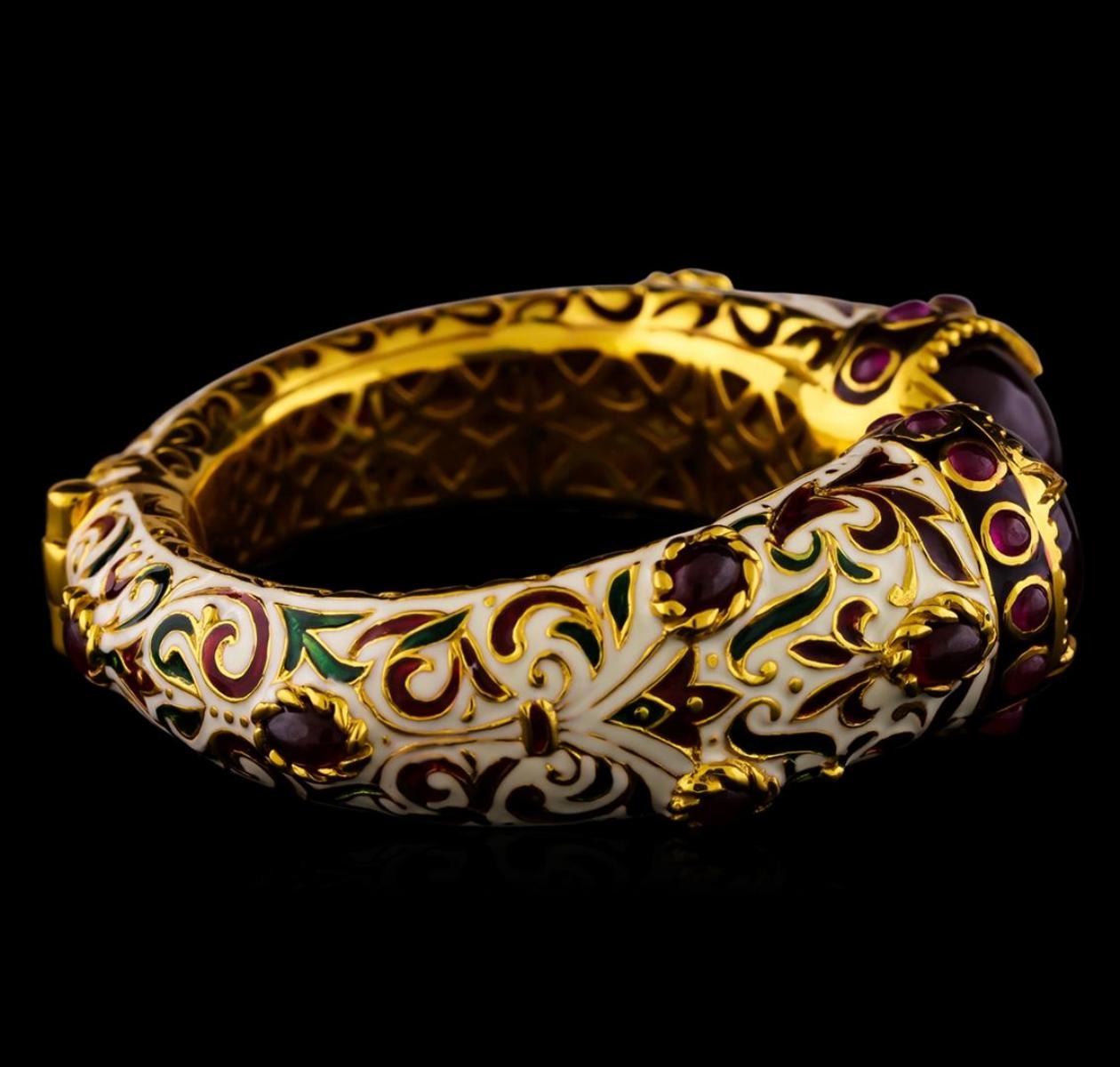 One of a kind high fashion sterling silver Bracelet weighing 105.1 grams. Containing: Ruby, Multi-color Enamel Inlay. This sterling silver promises a lasting shine.