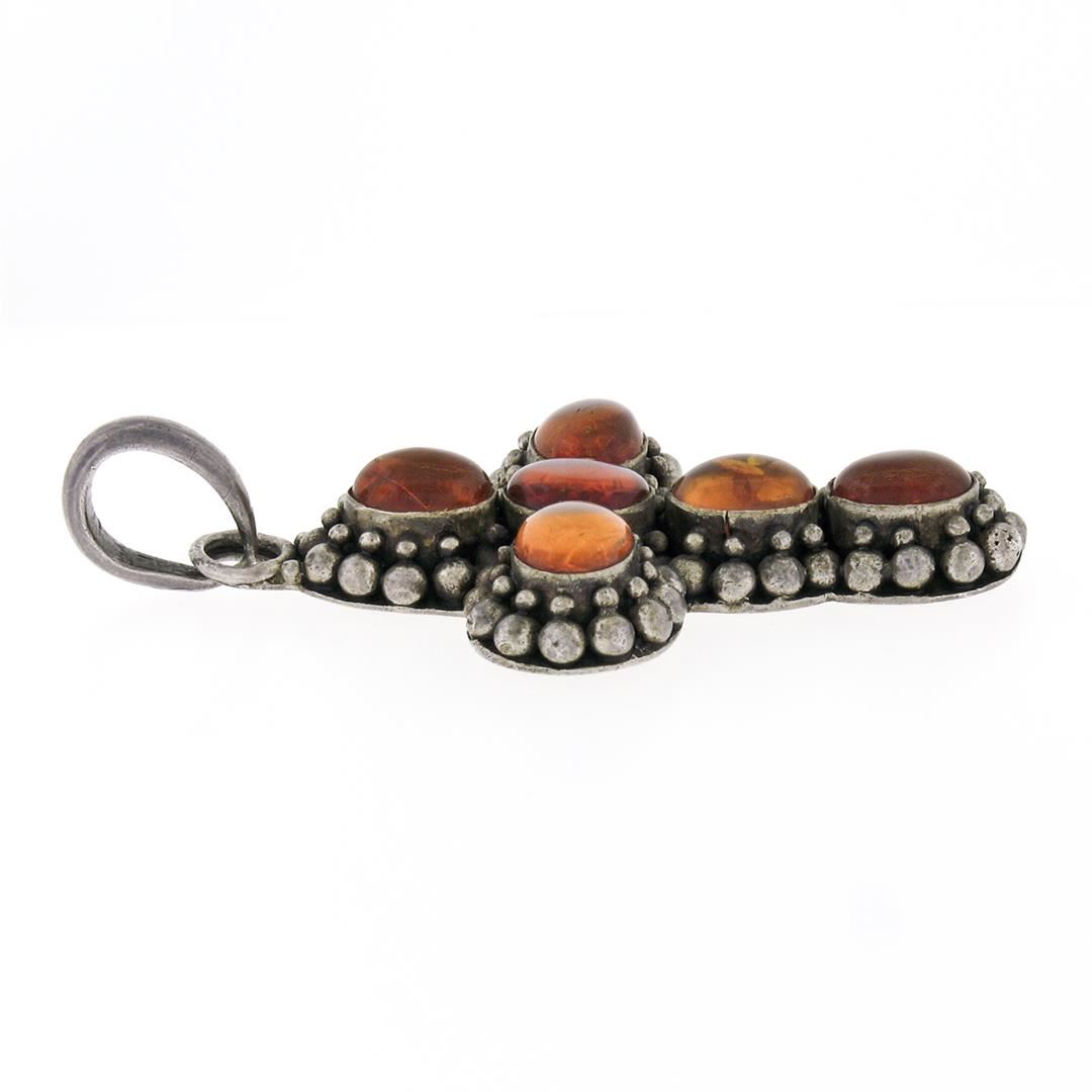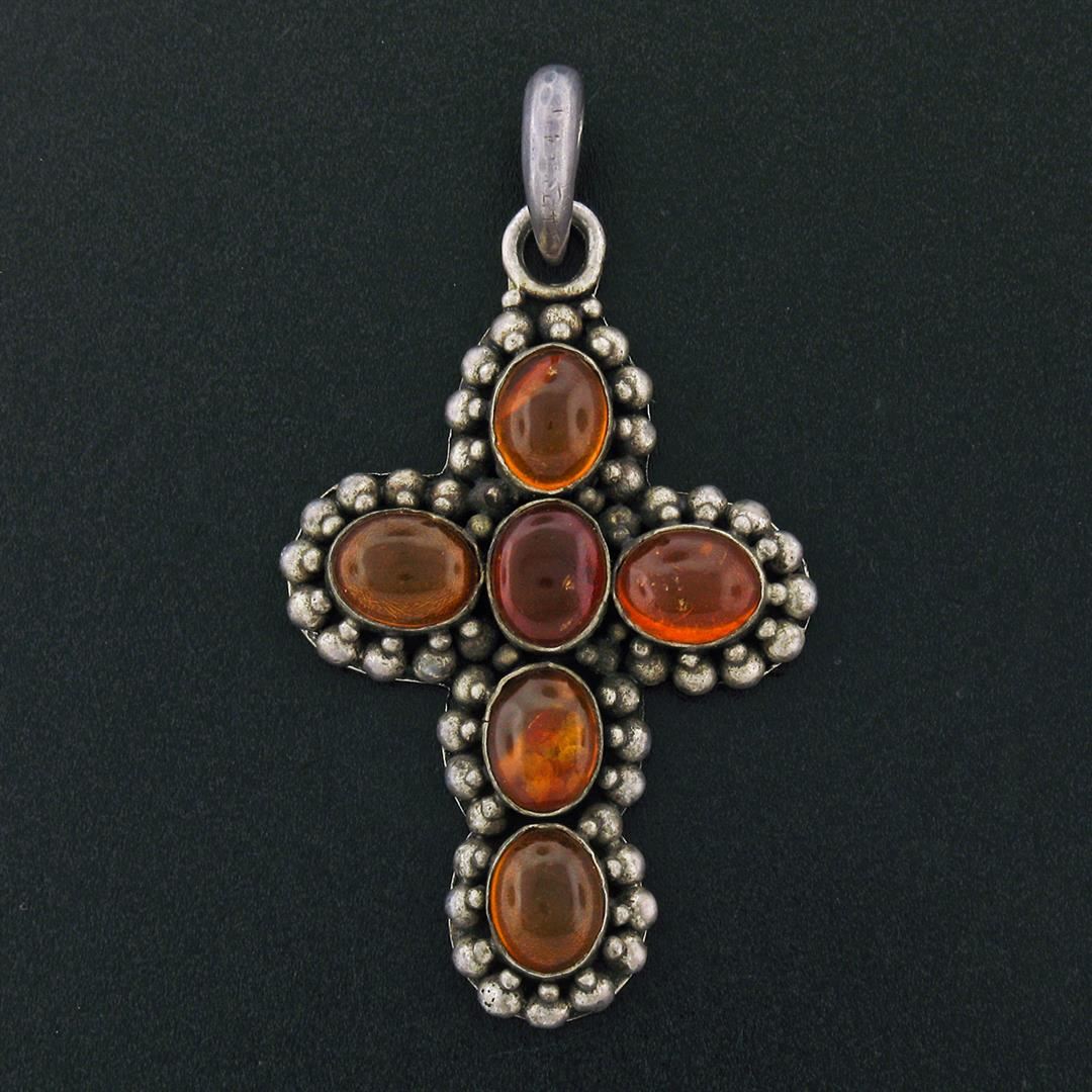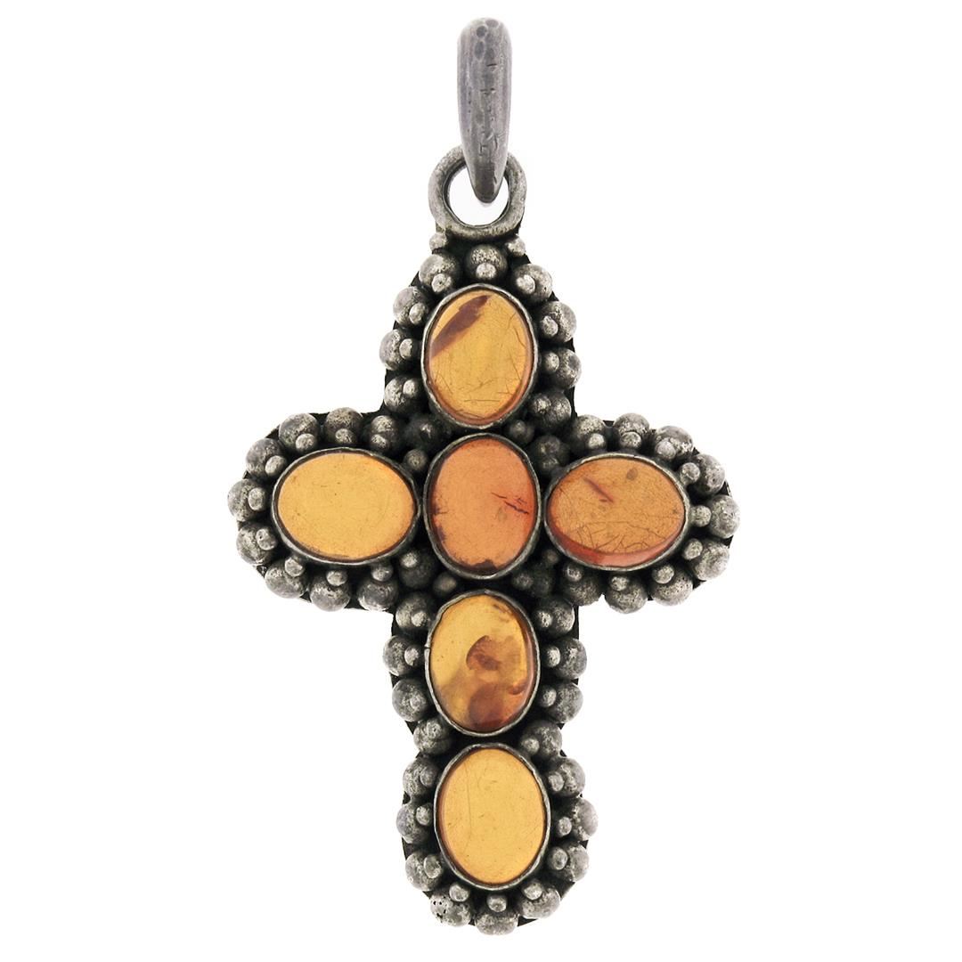 One Antique Sterling Silver Oval Cabochon Bezel Amber Cross Pendant & Bead Work Halo. Item Details: Material: Solid .925 Sterling Silver, Weight: 16.41 Grams, Stone(s): (6) Natural Genuine Amber - Oval Cabochon Cut - Bezel Set - Rich Orange Color - 9.0x7.0mm (approx.), Chain Type: Not Included, Bail Dimensions: 9.30x7.15mm, Width: 33.75mm (1.32"), Height: 63.0mm (2.48"), Thickness: 8.40mm. Condition: Antique piece w/ original finish and patina preserved. Excellent condition!