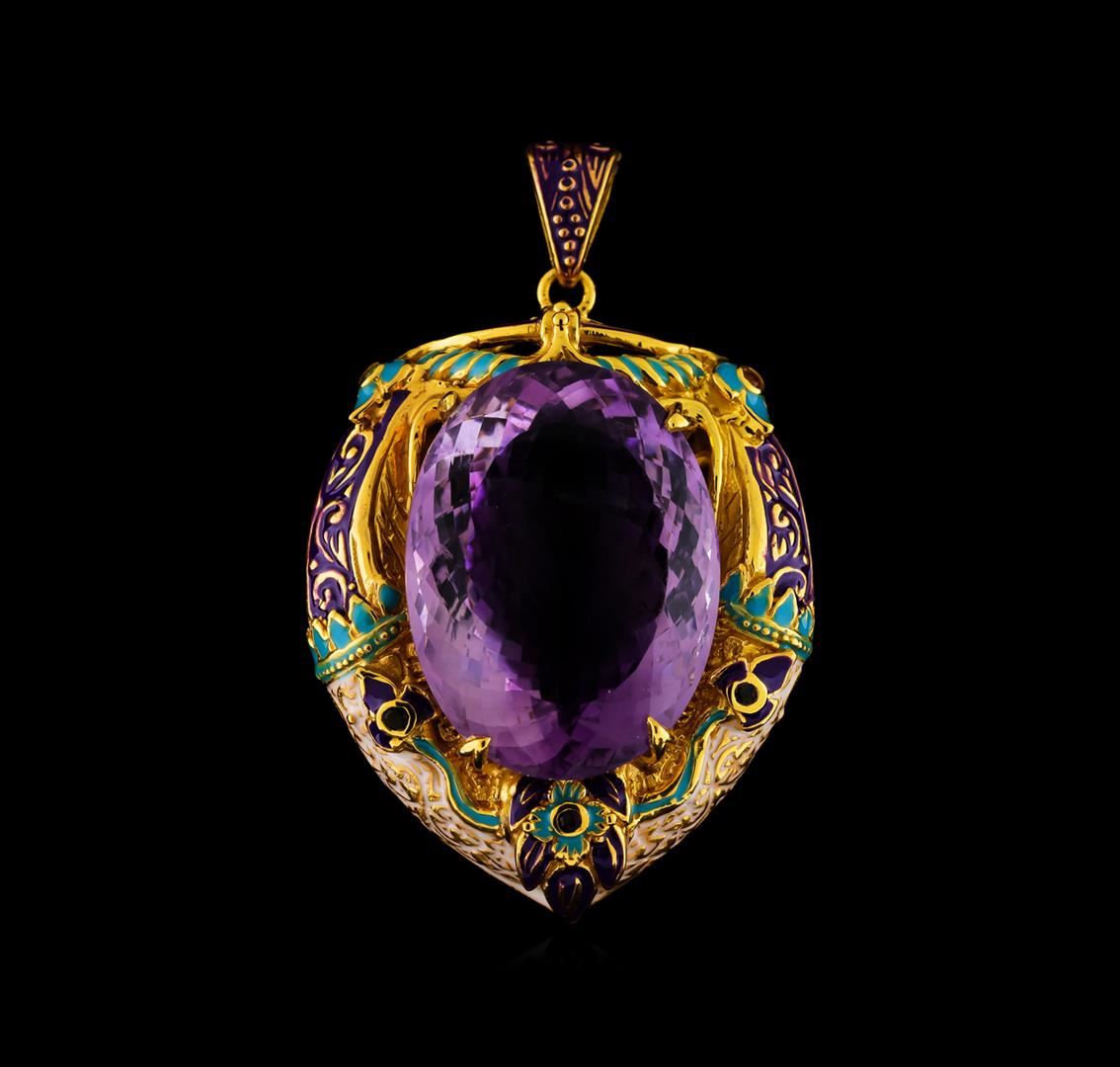 One of a kind high fashion sterling silver Pendant weighing 49.6 grams. Containing: Amethyst, Tourmaline, Violet Enamel Inlay, Turquoise Enamel Inlay. This sterling silver promises a lasting shine.