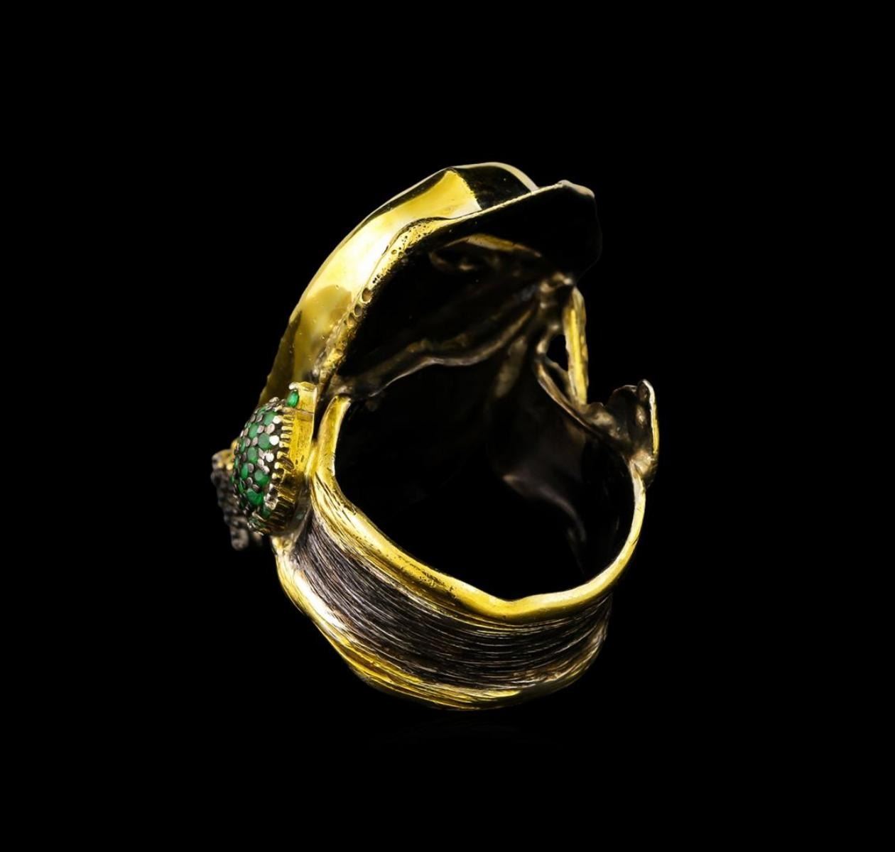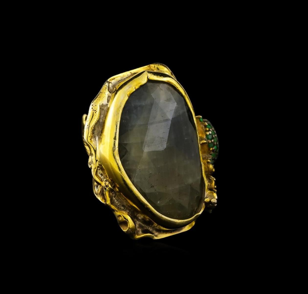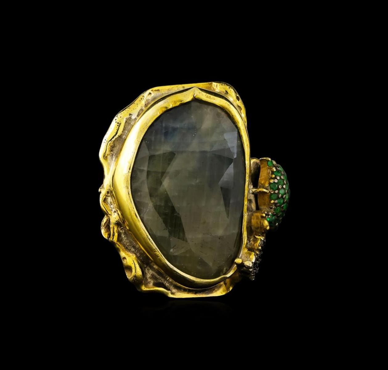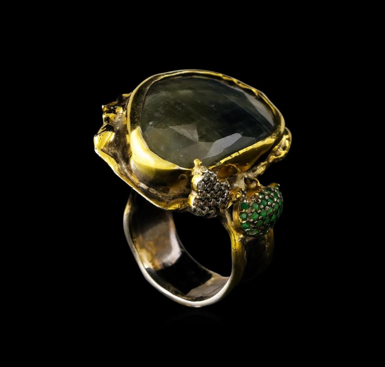 One of a kind high fashion sterling silver Ring weighing 17.7 grams. Black Antique texture. Containing: Corundum, Green Crystal, White Crystal. This sterling silver promises a lasting shine.