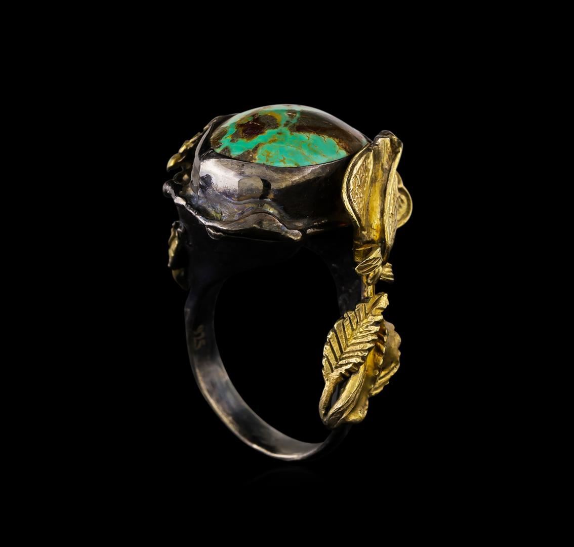 One of a kind high fashion sterling silver Ring weighing 23 grams. Black Antique texture. Containing: Turquoise. This sterling silver promises a lasting shine.