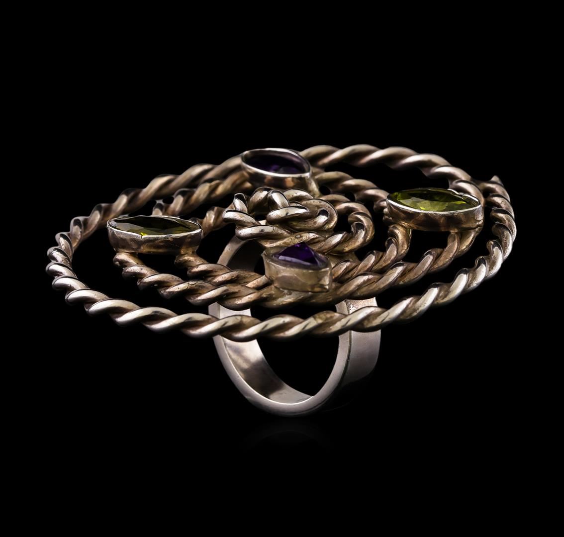 One of a kind high fashion sterling silver Ring weighing 22.9 grams. Containing: Purple Crystal, Yellowish Green Crystal. This sterling silver promises a lasting shine.