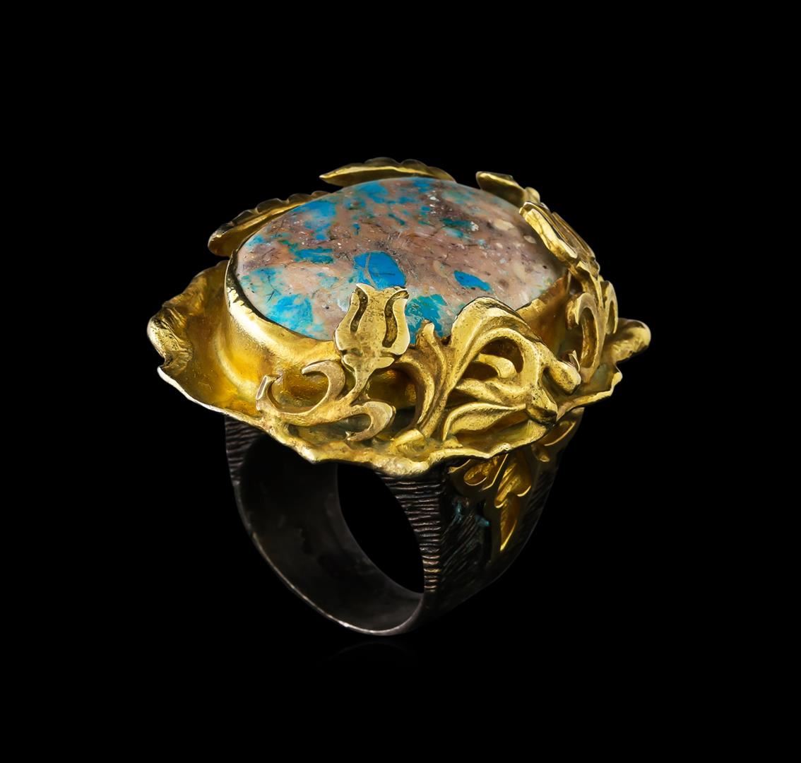 One of a kind high fashion sterling silver Ring weighing 40.4 grams. Black Antique texture. Containing: Created Turquoise. This sterling silver promises a lasting shine.