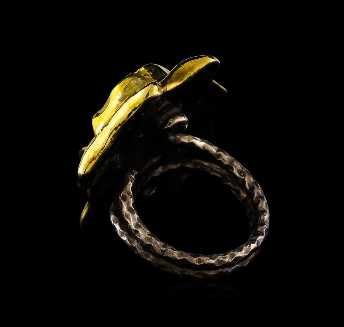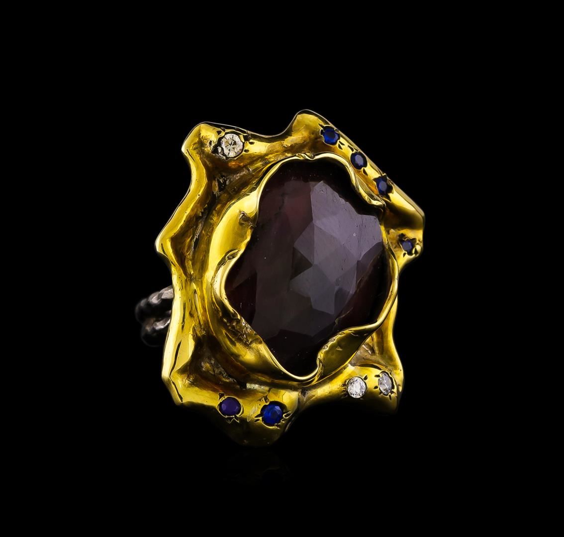 One of a kind high fashion sterling silver Ring weighing 14.9 grams. Black Antique texture. Containing: Ruby, White Crystal, Blue Crystal. This sterling silver promises a lasting shine.