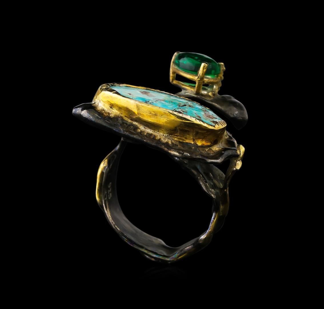 One of a kind high fashion sterling silver Ring weighing 12 grams. Containing: Turquoise, Green Crystal. This sterling silver promises a lasting shine.