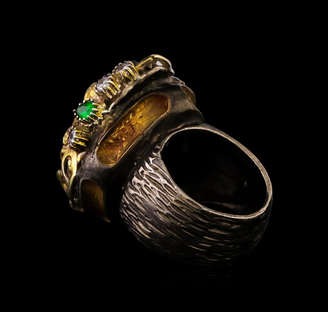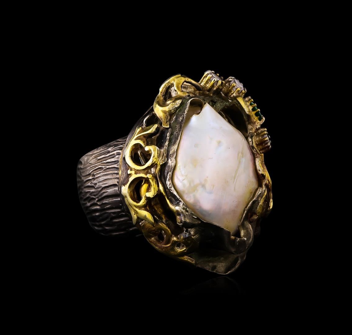 One of a kind high fashion sterling silver Ring weighing 38.1 grams. Black Antique texture. Containing: Freshwater Pearl, White Crystal, Green Crystal. This sterling silver promises a lasting shine.