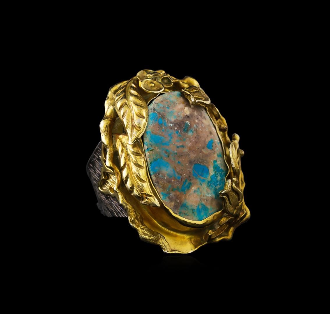 One of a kind high fashion sterling silver Ring weighing 40.4 grams. Black Antique texture. Containing: Created Turquoise. This sterling silver promises a lasting shine.