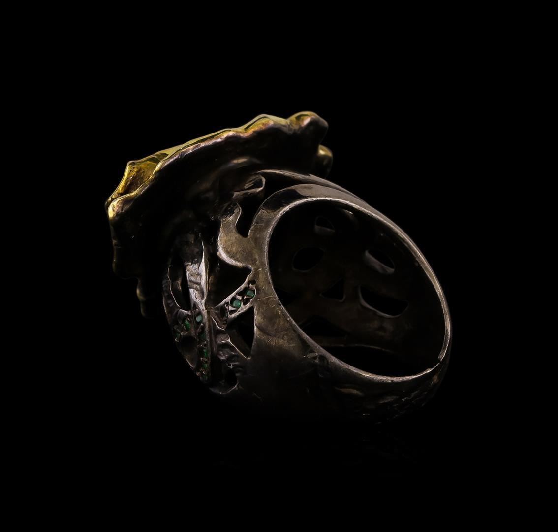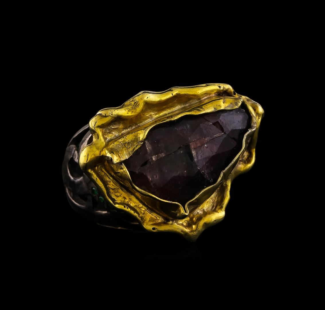 One of a kind high fashion sterling silver Ring weighing 20 grams. Containing: Corundum, Green Crystal. This sterling silver promises a lasting shine.