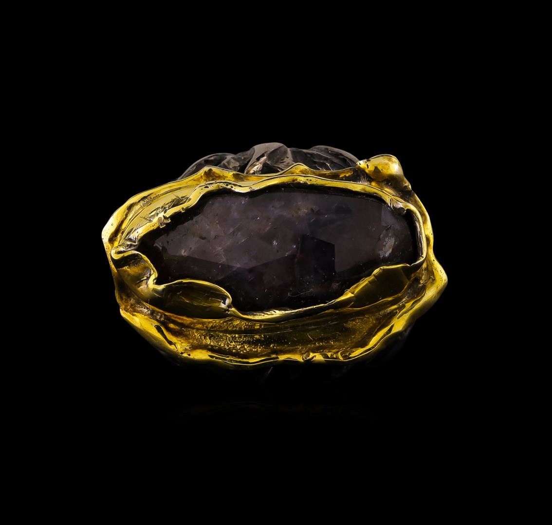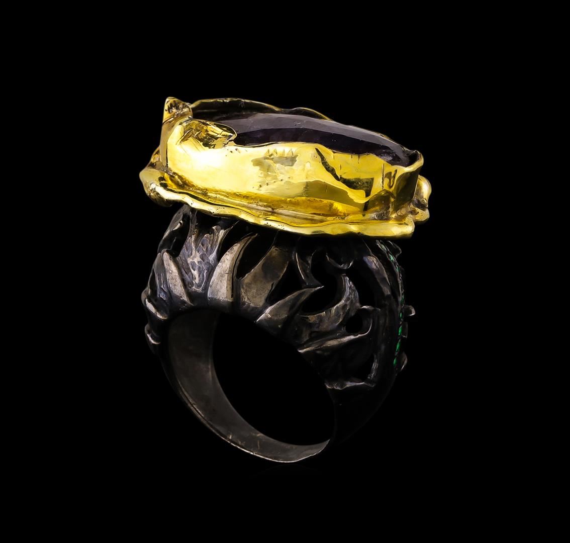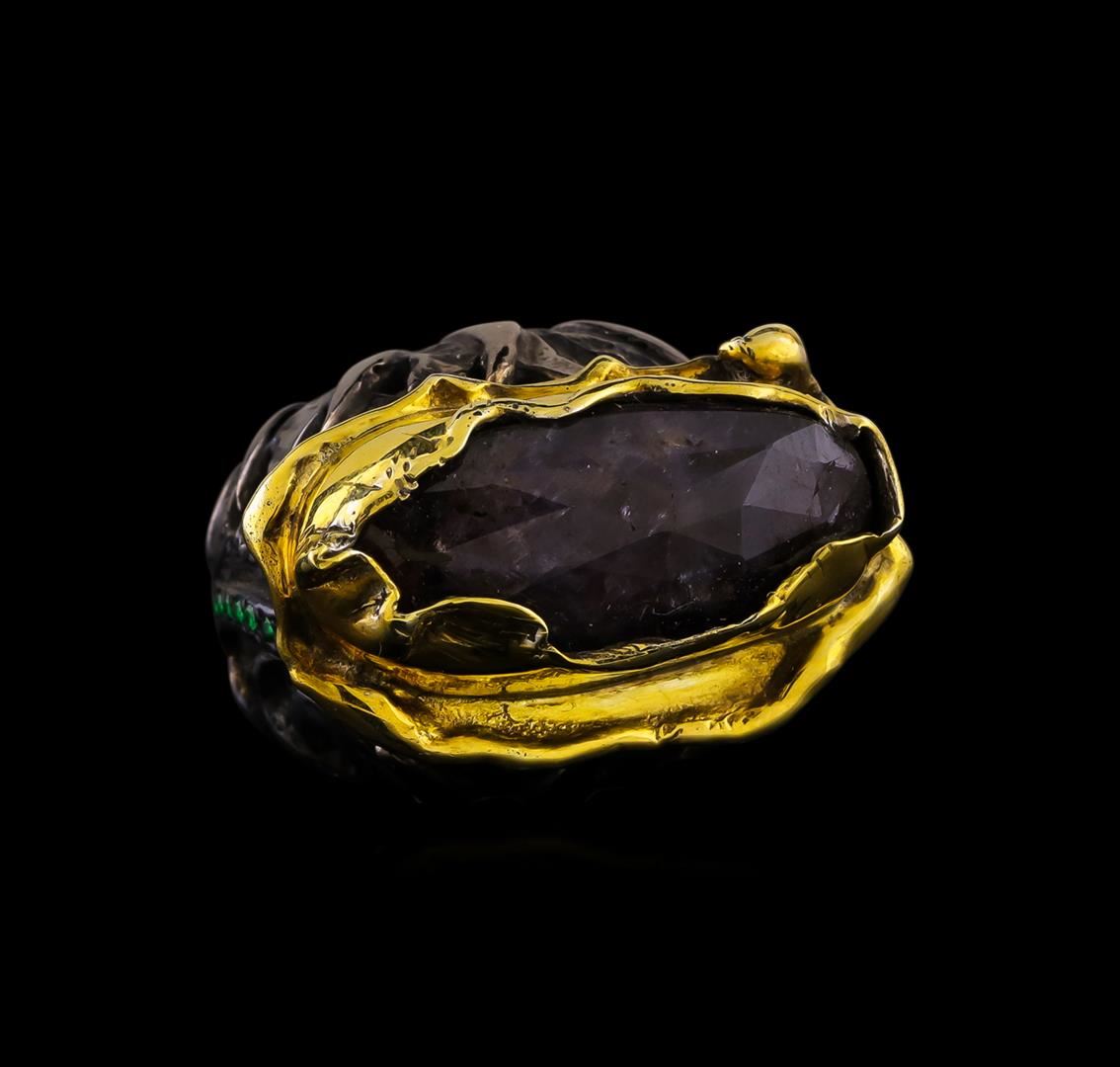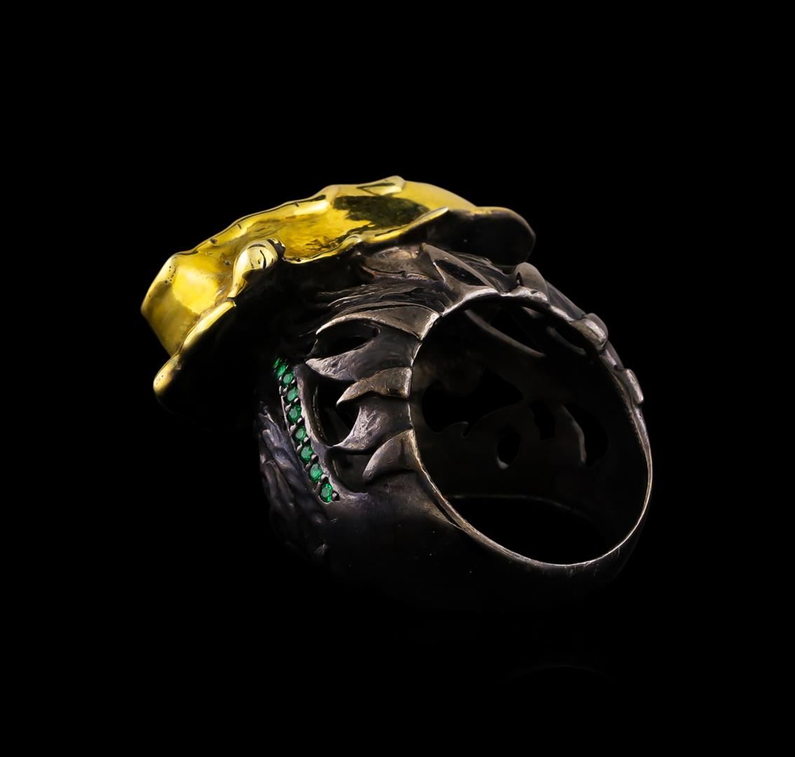 One of a kind high fashion sterling silver Ring weighing 23.1 grams. Black Antique texture. Containing: Corundum, Green Crystal. This sterling silver promises a lasting shine.