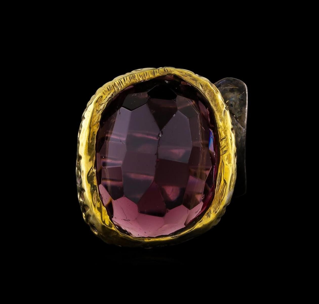 One of a kind high fashion sterling silver Ring weighing 32.8 grams. Black Antique texture. Containing: Purple Crystal. This sterling silver promises a lasting shine.