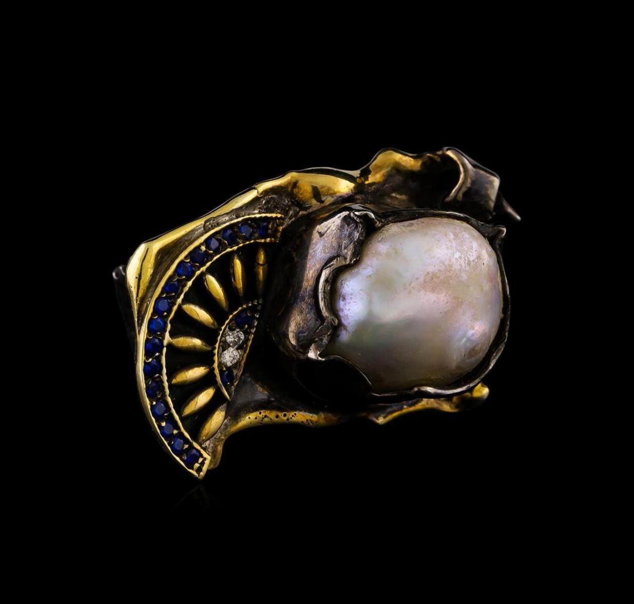 One of a kind high fashion sterling silver Ring weighing 31 grams. Black Antique texture. Containing: Natural Pearl, White Crystal, Blue Crystal. This sterling silver promises a lasting shine.