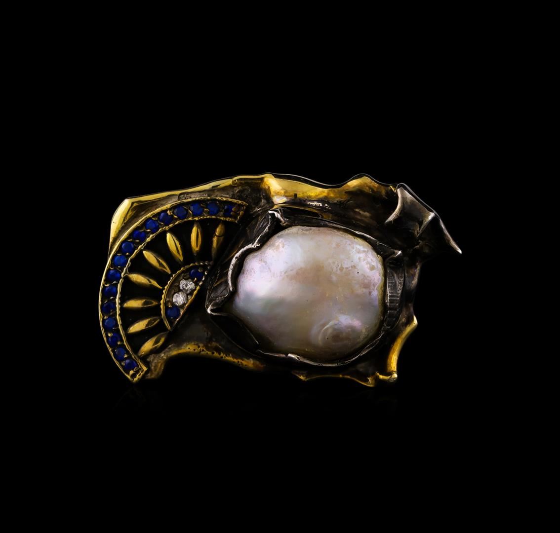 One of a kind high fashion sterling silver Ring weighing 31 grams. Black Antique texture. Containing: Natural Pearl, White Crystal, Blue Crystal. This sterling silver promises a lasting shine.