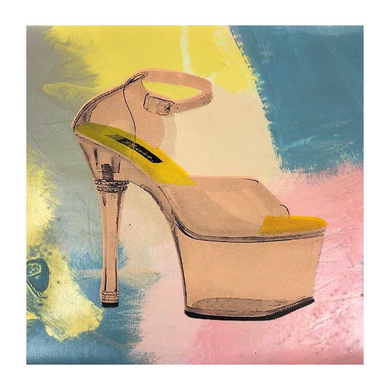 Stripper Shoes is a limited edition hand pulled silkscreen mixed media on canvas by Andy Warhol protege Steve Kaufman (1960-2010). This piece is numbered and 45/50 and hand signed inverso. Includes letter of authenticity. As is common with Kaufman's works, this piece may have perceived minor flaws, but is in overall good condition. Measures approximately 17" x 17" (image).