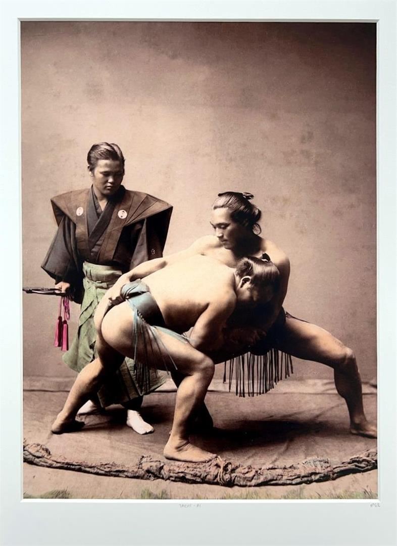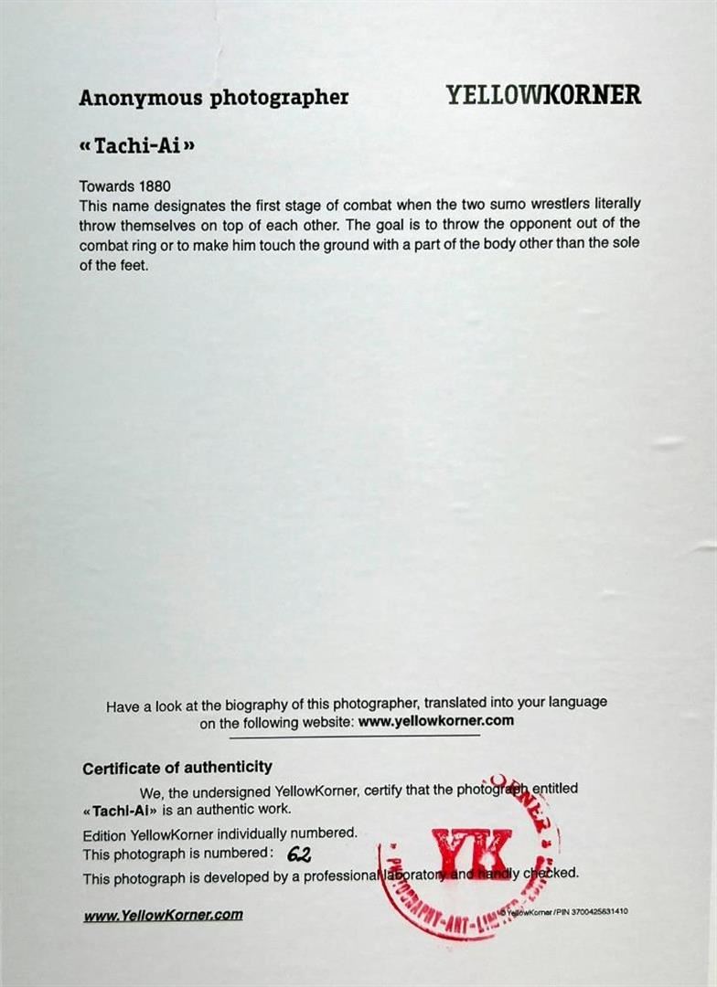 Sumo Wrestling Japan Wrestler Tachi-Ai YellowKorner Certified Photograph. Certificate of Authenticity from YellowKorner affixed to the back. Matted Dimensions 16"x20". Protected with Clear Mylar Sleeve.