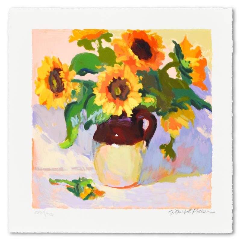 "Sunflowers" is a limited edition giclee on paper by S. Burkett Kaiser, numbered and hand signed by the artist. Includes Letter of Authenticity. Measures approx. 15" x 15" (border), 12" x 12" (image).