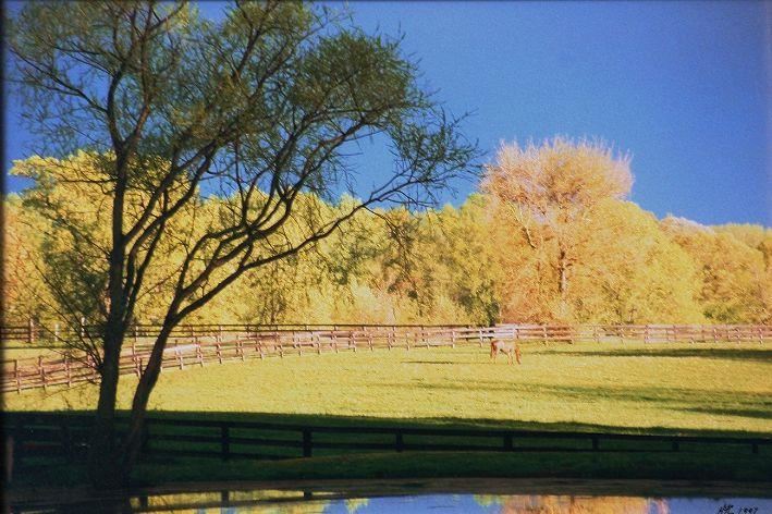 Professionally framed photograph of a grazing horse in a "sunny pasture". Hand signed lower right in monogram by Artist. Approx. 23.5 "x 27.5" framed.